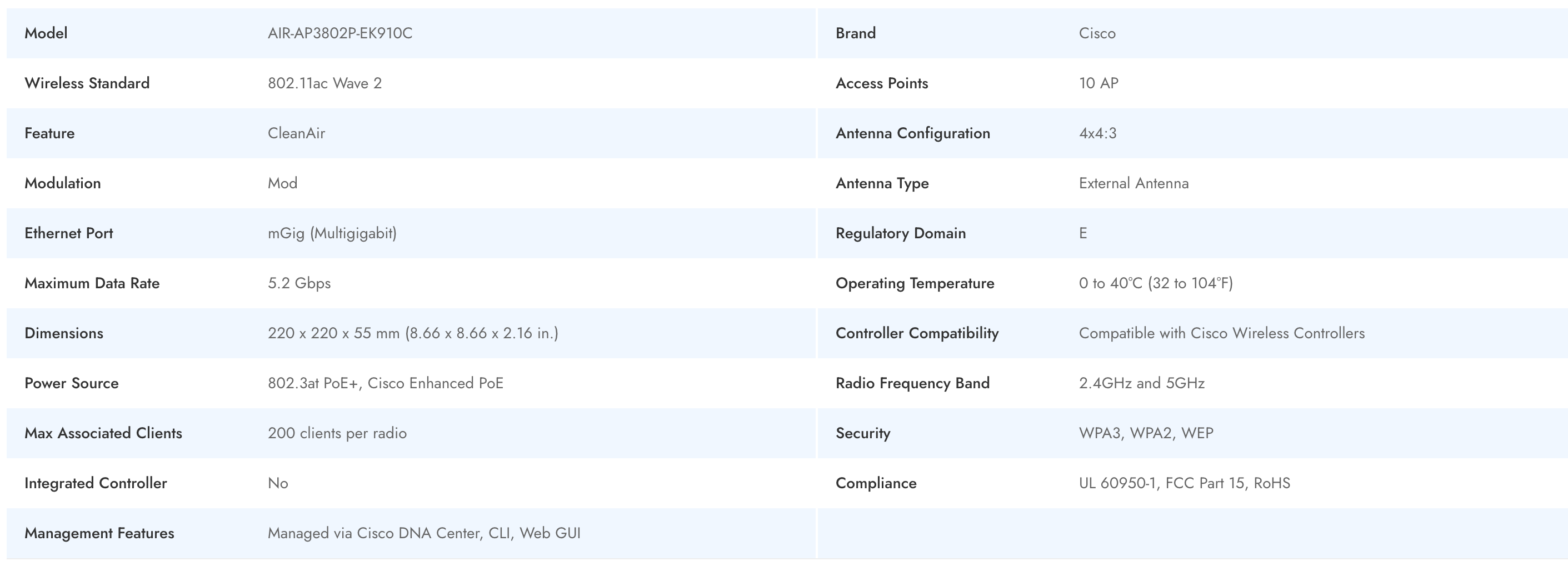 The Cisco AIR-AP3802P-EK910C is an enterprise-class access point engineered to deliver high-performance wireless connectivity for mid-to-large business and industrial environments. Supporting the advanced 802.11ac Wave 2 wireless standard, this access point provides reliable coverage, robust client capacity, and fast data rates to support demanding applications and dense device populations. Its integration of CleanAir technology and external antenna design ensures optimum spectrum efficiency and fewer RF issues, making it ideal for organizations looking to modernize their wireless infrastructure and maximize network uptime.