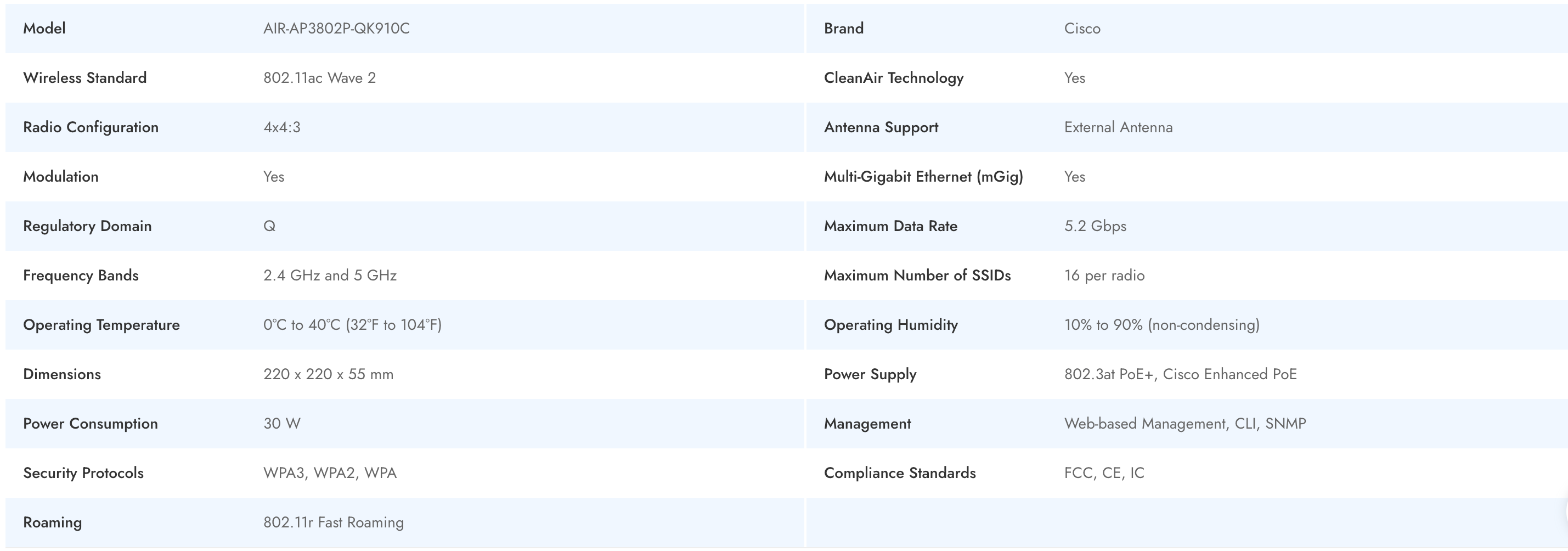 The Cisco AIR-AP3802P-QK910C is a high-performance enterprise access point built for organizations that demand robust, scalable wireless networking. Leveraging the 802.11ac Wave 2 standard, this access point delivers exceptional throughput, extensive client capacity, and advanced security features. With support for external antennas and multi-gigabit Ethernet, it ensures optimal coverage and flexibility in various deployment scenarios. Ideal for demanding enterprise settings, the AIR-AP3802P-QK910C seamlessly meets the needs of modern, high-density wireless networks.