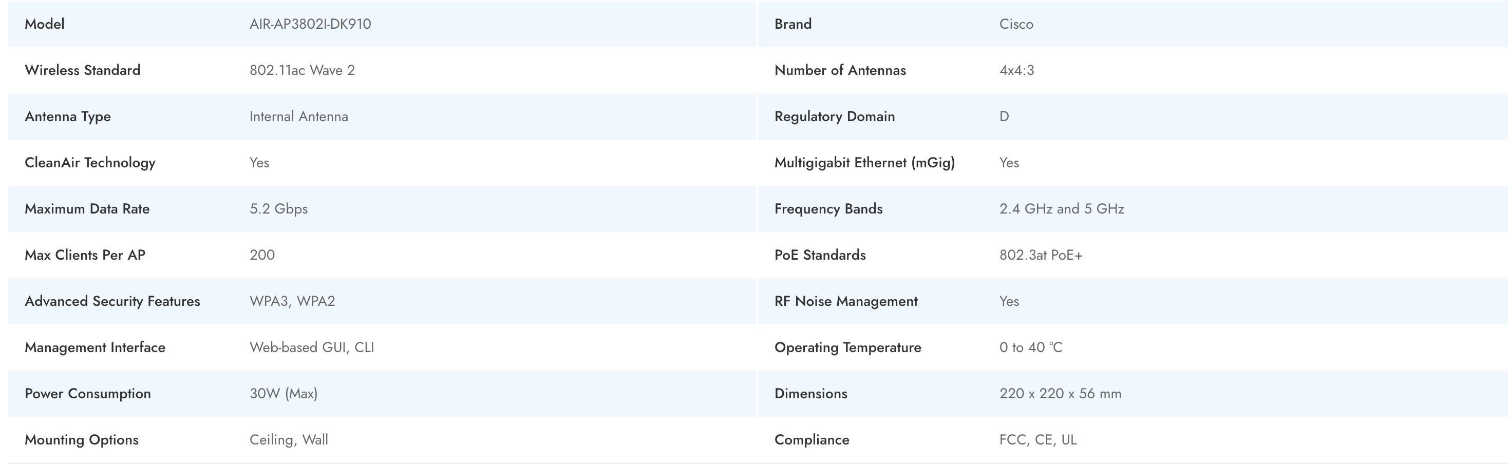 The Cisco AIR-AP3802I-DK910 is an enterprise-class access point designed to deliver high-capacity wireless connectivity with advanced security and integrated management. Utilizing the 802.11ac Wave 2 standard and multigigabit Ethernet support, this access point ensures stable, high-speed performance for dense office and campus environments. Its internal antenna design, CleanAir technology, and RF noise management provide robust coverage and minimal interference. With a maximum data rate of 5.2 Gbps and support for up to 200 clients per access point, it is ideal for business-critical wireless deployments demanding reliable, scalable performance.