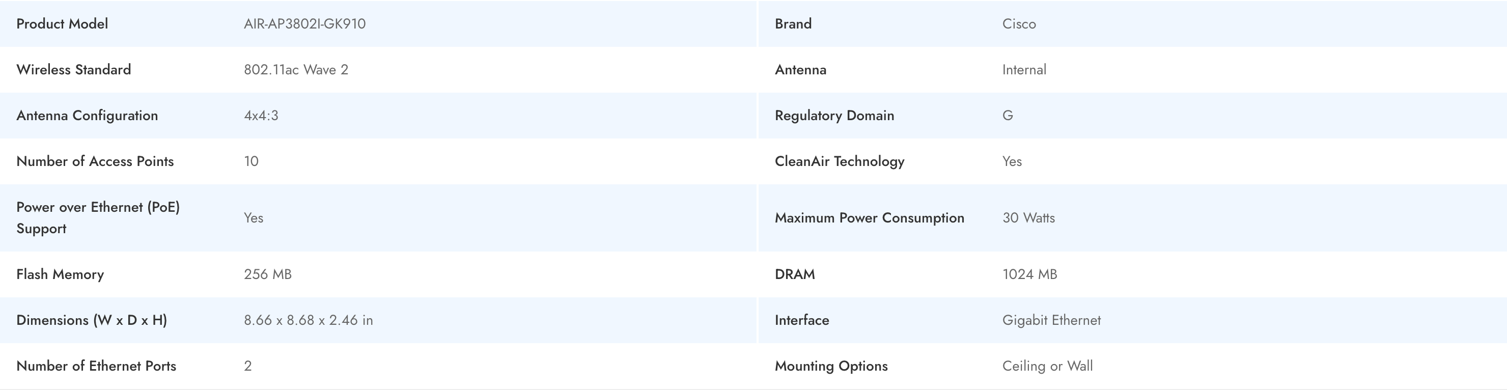 The Cisco AIR-AP3802I-GK910 is an enterprise-class access point engineered to deliver high-density Wi-Fi coverage for critical business environments. Leveraging 802.11ac Wave 2 wireless technology and an internal 4x4:3 antenna array, this Cisco access point supports advanced features, such as CleanAir technology for RF interference mitigation and robust Power over Ethernet (PoE) integration. With its gigabit Ethernet support and optimized form factor for ceiling or wall mounting, the AIR-AP3802I-GK910 is ideal for organizations demanding reliable and scalable wireless performance across diverse deployment scenarios.