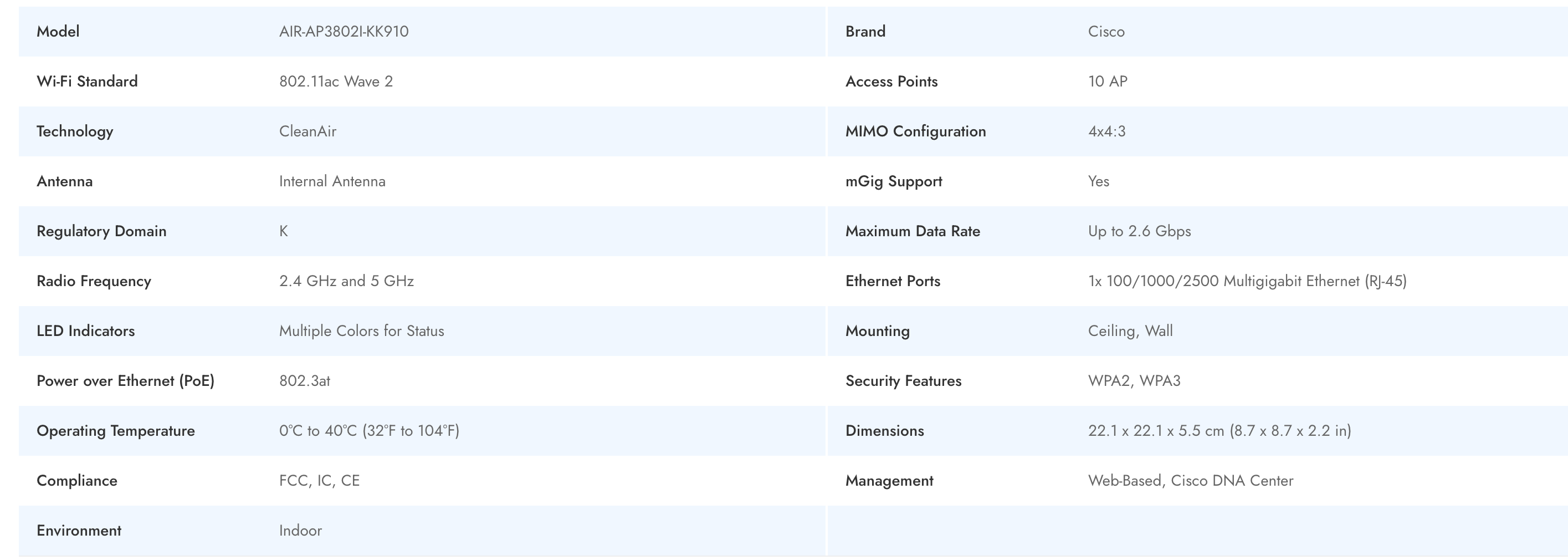 The Cisco AIR-AP3802I-KK910 is an enterprise-class access point purpose-built for high-density, mission-critical wireless environments. Supporting 802.11ac Wave 2 with 4x4:3 MIMO, it delivers up to 2.6 Gbps data rates on both 2.4 GHz and 5 GHz bands. Advanced security features including WPA2 and WPA3 ensure robust protection, while PoE (802.3at) enables flexible deployment. Designed for businesses needing seamless connectivity, this model features Cisco CleanAir technology and intuitive management via Cisco DNA Center.