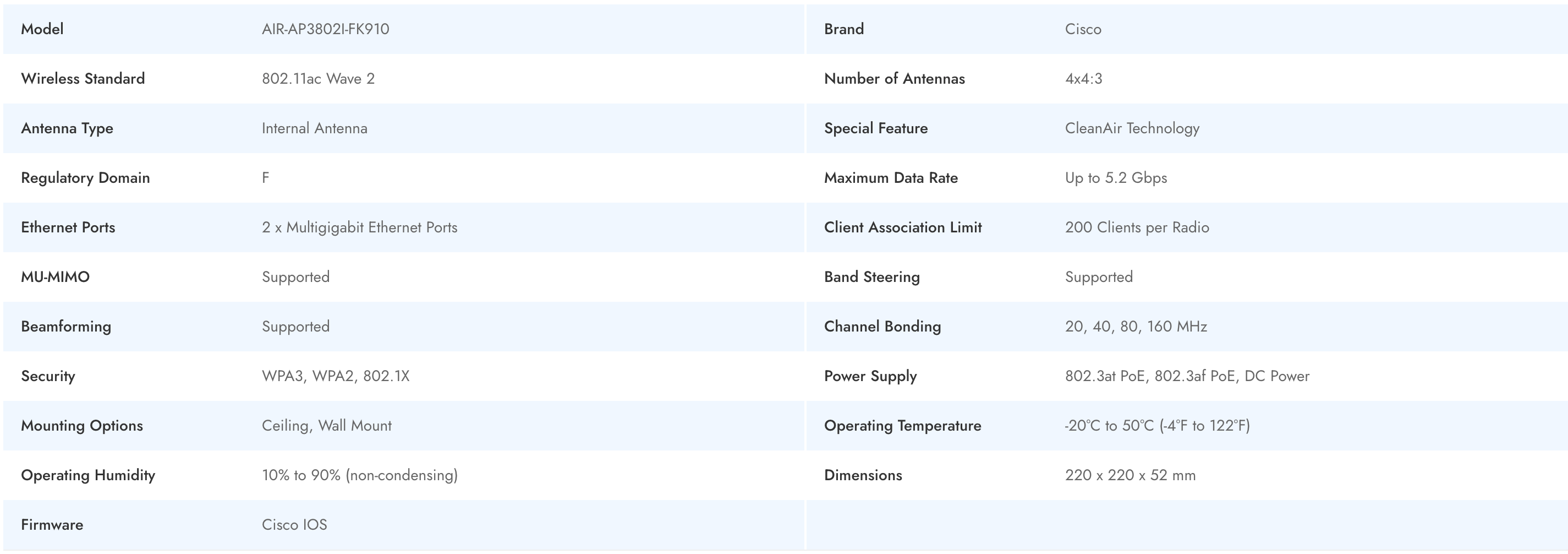Cisco AIR-AP3802I-FK910 is an advanced enterprise-class access point, crafted for high-density network environments demanding superior wireless performance. Supporting the 802.11ac Wave 2 wireless standard, this Cisco access point enables throughput up to 5.2 Gbps and utilizes 4x4:3 MU-MIMO internal antenna configuration for optimized multi-user experiences. With CleanAir Technology and dual multigigabit Ethernet ports, it delivers robust connectivity, interference mitigation, and secure access, making it ideal for mission-critical business wireless deployments across large campuses or branch offices seeking scalable, seamless coverage and reliable mobility solutions.