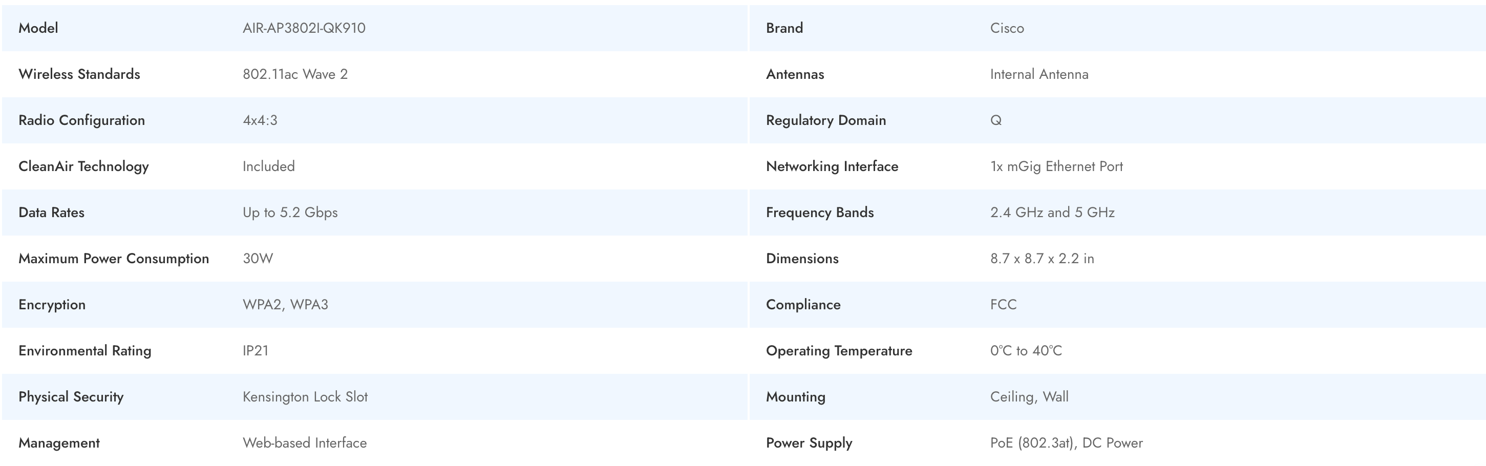 The Cisco AIR-AP3802I-QK910 is an enterprise-grade access point built for advanced wireless network performance and reliability. Supporting 802.11ac Wave 2, it delivers fast speeds up to 5.2 Gbps and dual-band coverage for 2.4 GHz and 5 GHz frequencies. With integrated internal antennas, CleanAir technology, and robust WPA2/WPA3 encryption, this model addresses modern business connectivity needs. Its multi-gigabit Ethernet port, flexible mounting options, and efficient PoE/DC powering make it ideal for scalable deployments in demanding enterprise environments.
