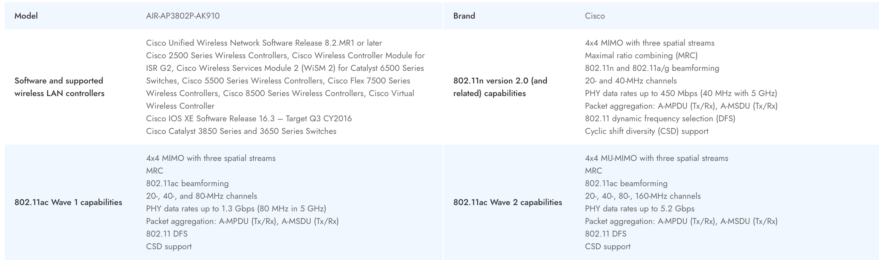 The Cisco AIR-AP3802P-AK910 is an enterprise-class access point purpose-built for high-density environments demanding superior wireless performance and flexible management. Utilizing 802.11ac Wave 2 technology, this Cisco access point ensures seamless multigigabit connectivity and advanced wireless features such as 4x4 MU-MIMO, enhanced beamforming, and robust security support. Engineered to deliver optimized wireless experiences for growing business needs, AIR-AP3802P-AK910 is ideal for organizations upgrading to scalable, future-proof network infrastructure.