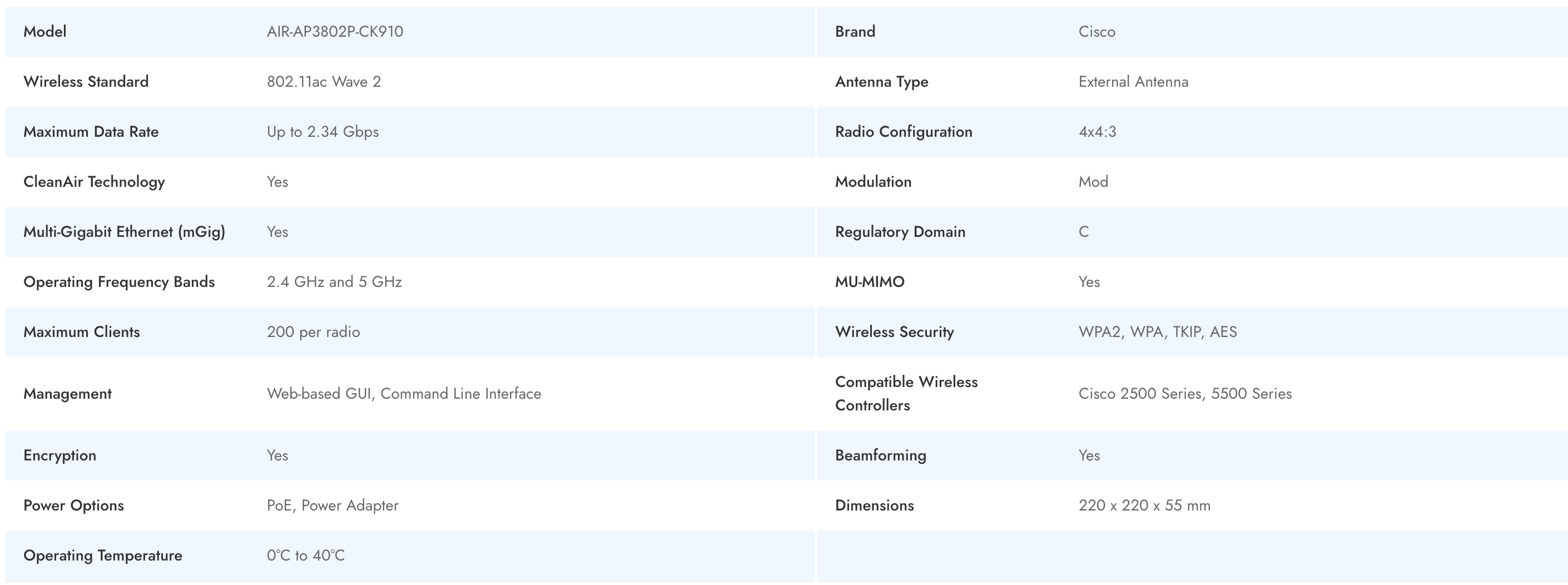 The Cisco AIR-AP3802P-CK910 is a high-performance enterprise access point built to deliver reliable wireless connectivity in demanding business environments. Supporting 802.11ac Wave 2, this Cisco access point features advanced security protocols and efficient multi-user capabilities, making it ideal for dense deployments. Its external antenna design, robust management options, and support for up to 200 clients per radio guarantee seamless network performance and flexibility. With Power over Ethernet (PoE) support and comprehensive compatibility with Cisco controllers, the AIR-AP3802P-CK910 ensures secure, scalable wireless infrastructure for organizations of any size.