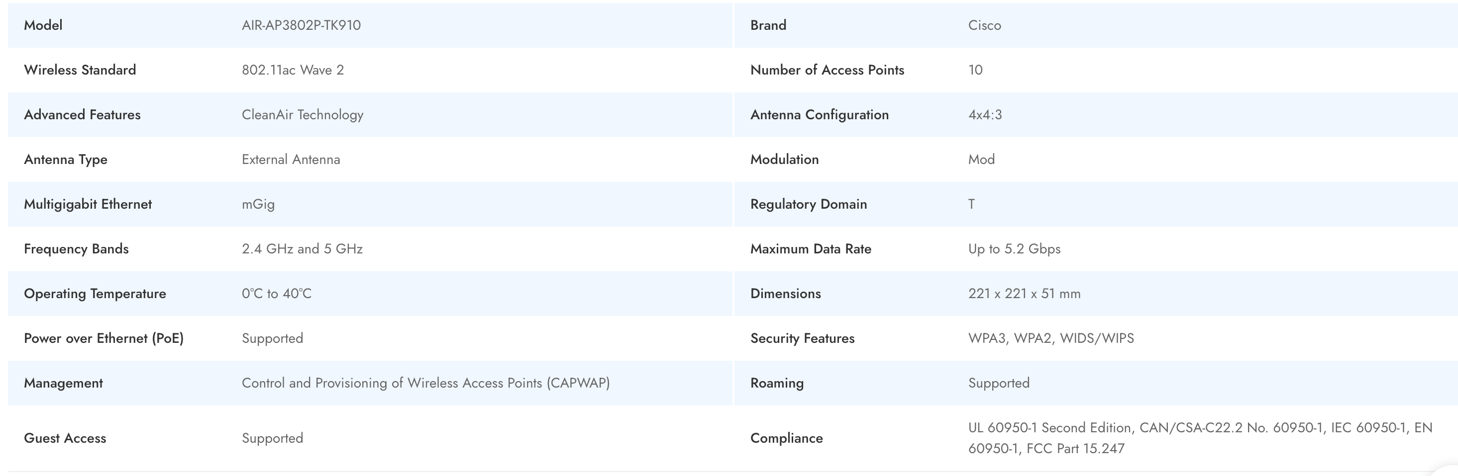 The Cisco AIR-AP3802P-TK910 is a high-end enterprise access point designed for demanding wireless environments. Leveraging 802.11ac Wave 2 technology and CleanAir features, it delivers robust wireless networking with advanced RF management. The 4x4:3 external antenna configuration boosts data throughput and coverage, while multigigabit Ethernet ensures high-speed backhaul. Integrated security protocols like WPA3 and advanced management via CAPWAP make this Cisco access point a secure, scalable, and efficient solution for modern business networks.
