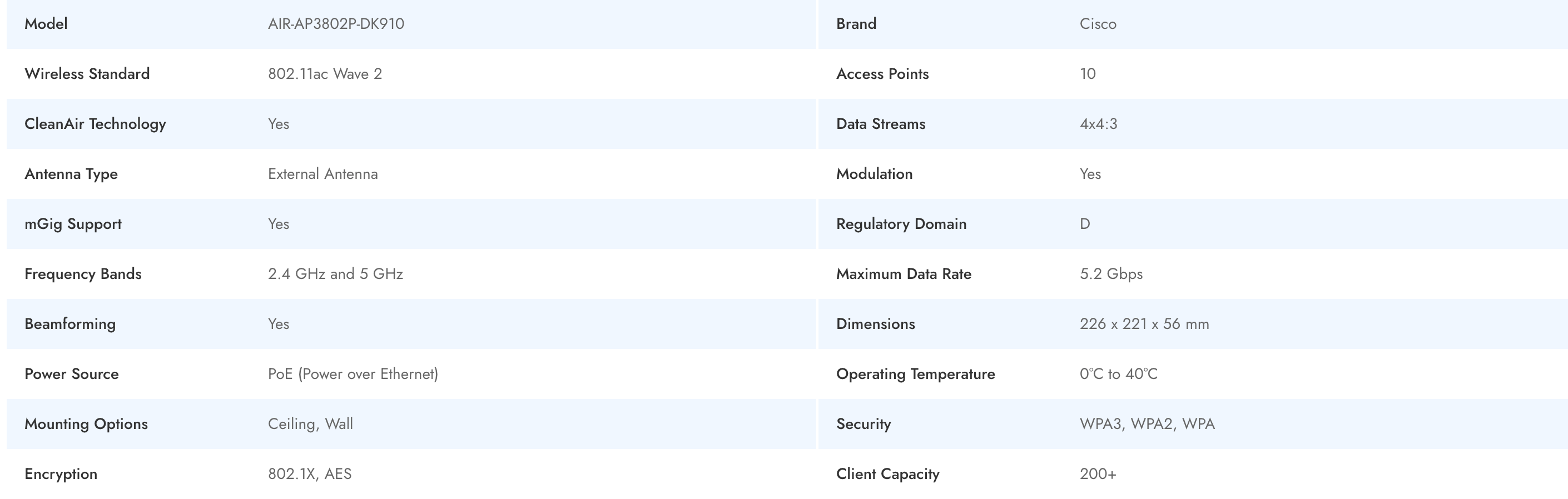 The Cisco AIR-AP3802P-DK910 is an enterprise-class access point engineered for high-density wireless environments. Leveraging 802.11ac Wave 2, this access point delivers dual-band performance across 2.4 GHz and 5 GHz, supporting a maximum data rate of 5.2 Gbps and advanced 4x4:3 MU-MIMO capabilities. Enhanced with CleanAir Technology and external antenna support, it ensures robust interference mitigation and extensive coverage for organizations of any size. The device features multiple security standards, including WPA3 and AES encryption, providing optimum protection for business-critical communications, while supporting over 200+ client connections to meet the demands of evolving enterprise networks.