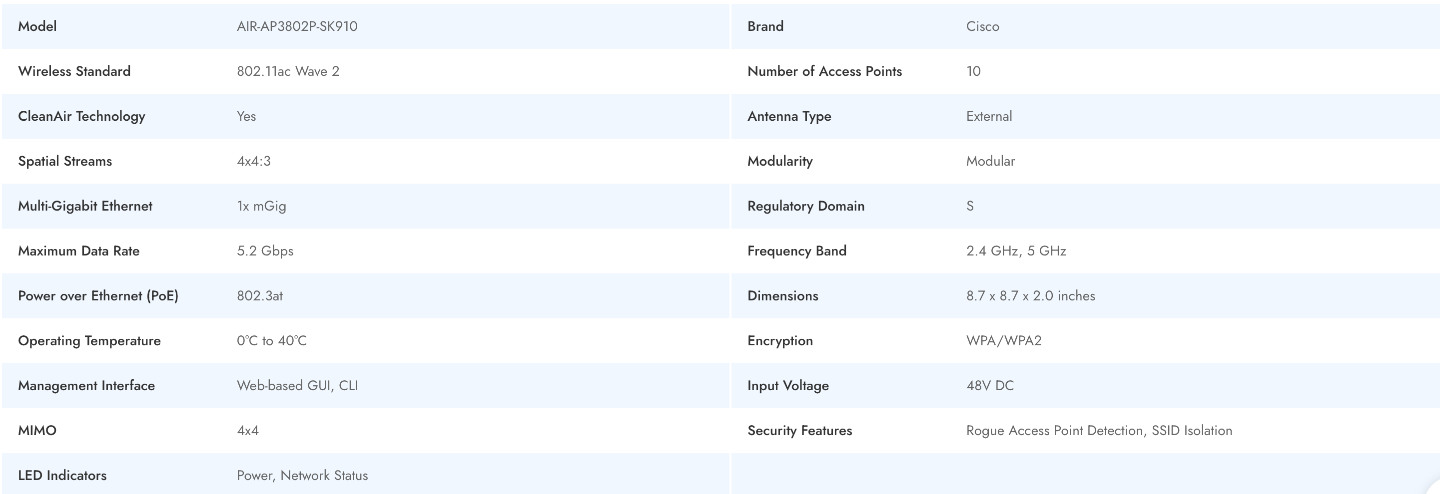 The Cisco AIR-AP3802P-SK910 is an advanced enterprise-class access point, designed to deliver robust wireless performance in high-density environments. Featuring 802.11ac Wave 2 wireless standard, this access point leverages 4x4:3 MIMO, external antennas, and up to 5.2 Gbps data rates to ensure exceptional network speed and coverage. Its modular design and CleanAir technology guarantee optimized spectrum management and scalability, while built-in PoE support and comprehensive security features make it ideal for businesses seeking reliable, secure, and scalable wireless connectivity.