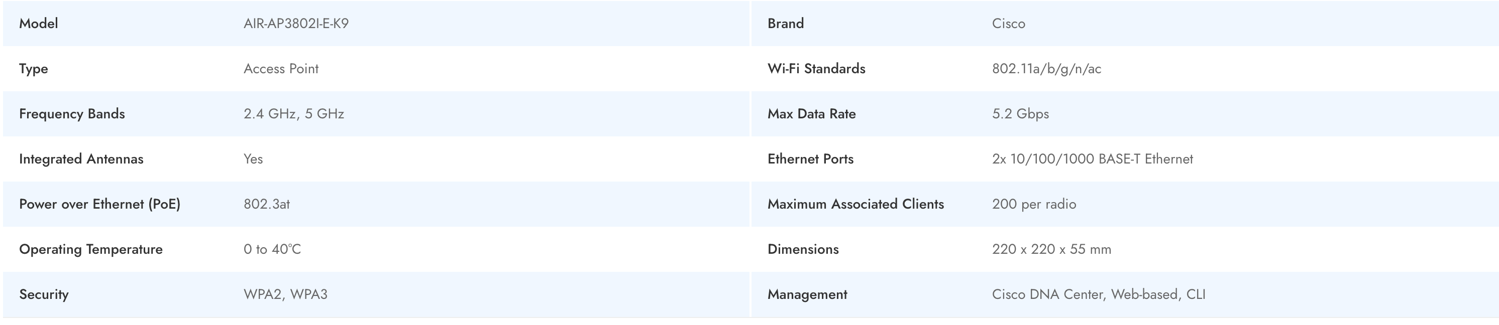 The Cisco AIR-AP3802I-E-K9 is an enterprise-class access point engineered for high-density wireless deployments. Offering seamless connectivity, this Cisco access point supports multiple Wi-Fi standards, robust 2.4 GHz and 5 GHz dual-band operation, and a maximum wireless data rate of 5.2 Gbps. Integrated antennas and advanced security protocols create a reliable and secure platform for organizations looking to empower workforce mobility. Its support for up to 200 clients per radio and dual gigabit Ethernet interfaces ensure both scalability and high throughput in dynamic enterprise network environments.
