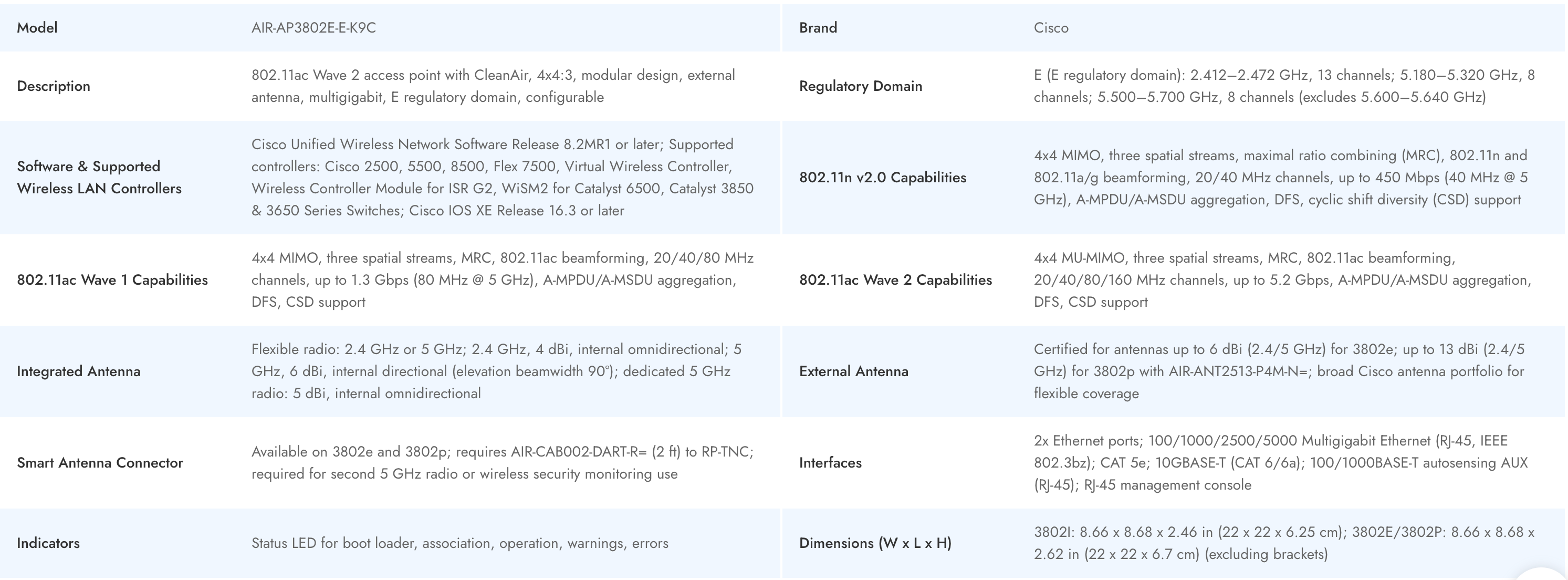 The Cisco AIR-AP3802E-E-K9C is an advanced enterprise-grade access point tailored for high-density network environments, delivering exceptional Wi-Fi performance and reliability. The 3802e uses the latest 802.11ac Wave 2 standard and features flexible access management to support business-critical applications. Its air-ap3802e-e-k9c modular hardware supports external antennas for versatile deployment, providing superior coverage and seamless wireless access in enterprise scenarios.