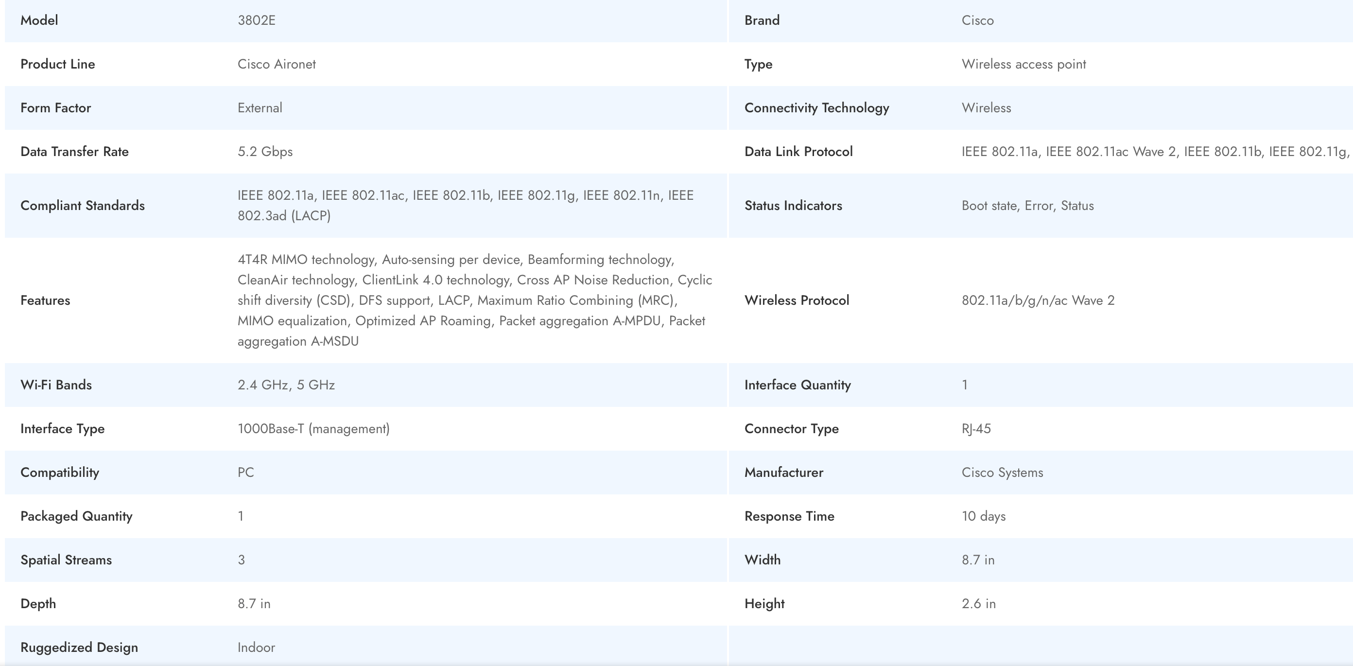 The Cisco AIR-AP3802E-B-K9 is an advanced enterprise-grade access point tailored to deliver high-speed, reliable wireless connections in demanding business environments. The 3802e series leverages the latest 802.11ac Wave 2 technologies to enable a robust, secure access layer for critical business operations. With impressive throughput up to 5.2 Gbps, the AIR-AP3802E-B-K9 ensures seamless data transfer and network efficiency for scalable deployments. Built for flexibility and performance, this Cisco access point supports diverse enterprise scenarios, making the air-ap3802e-b-k9 an optimal choice for organizations seeking next-generation wireless access.
