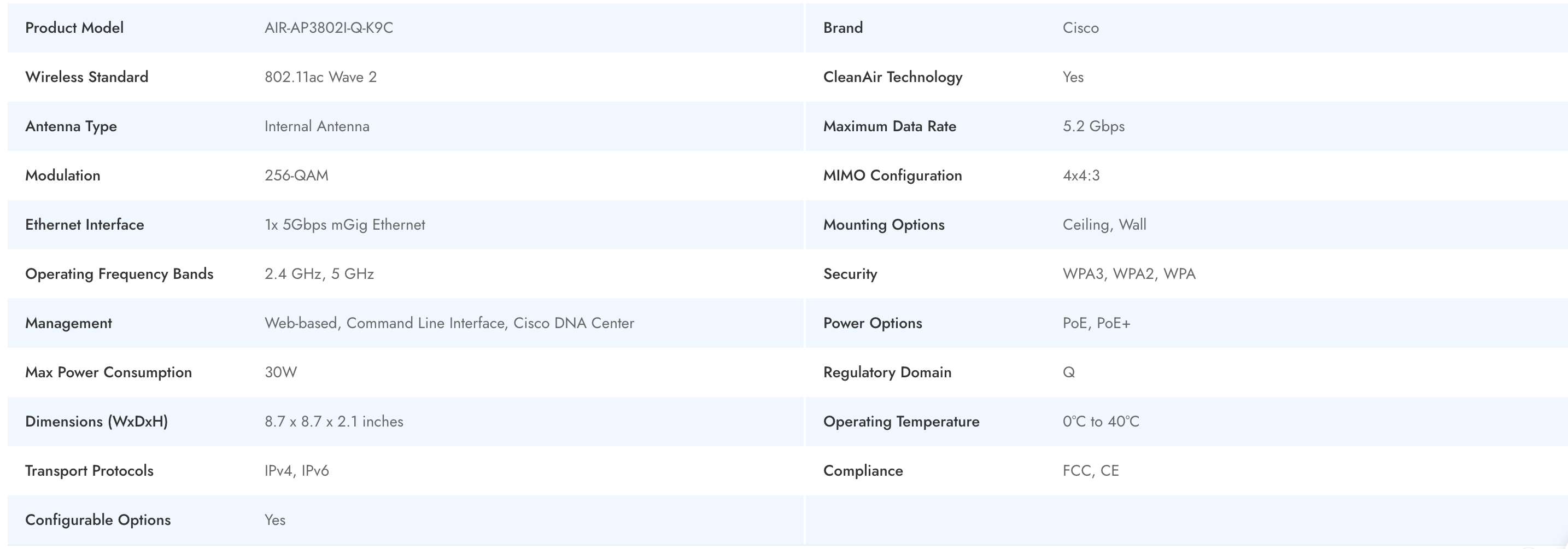 The Cisco AIR-AP3802I-Q-K9C is an advanced enterprise access point engineered for modern business networks. Supporting dual-band 802.11ac Wave 2, it delivers high-speed wireless at up to 5.2 Gbps, improved by 4x4:3 MIMO technology, and robust security including WPA3. Integrated CleanAir technology keeps RF environments interference-free, while flexible management via web interface, CLI, and Cisco DNA Center simplifies operations. Designed for scalable deployment with ceiling and wall mounting, it ensures reliable, high-capacity wireless access for demanding business applications across diverse environments.