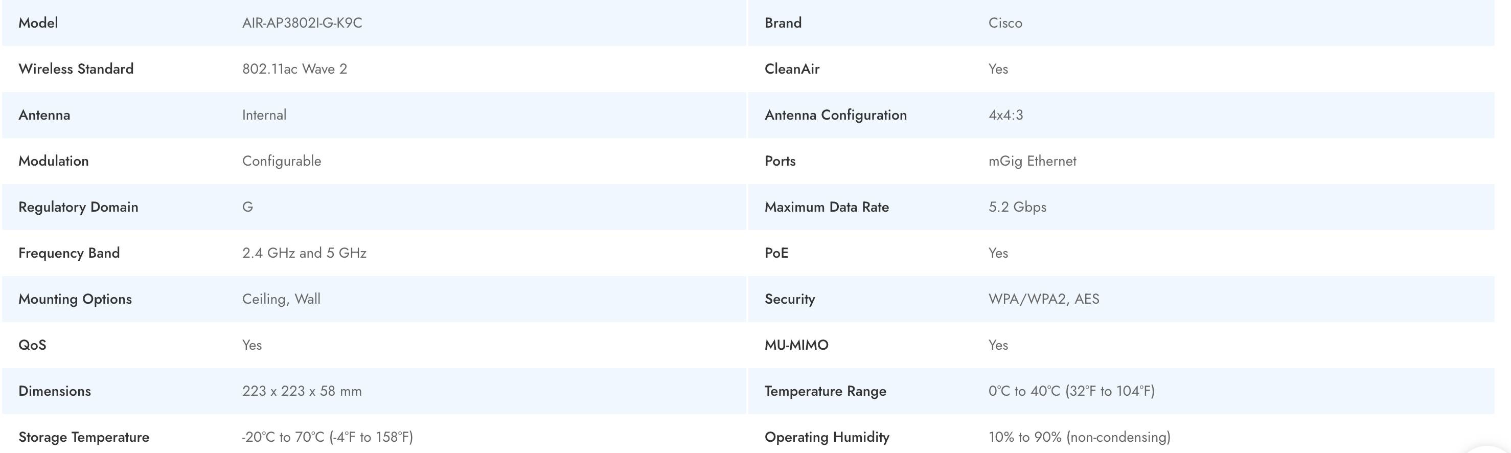 The Cisco AIR-AP3802I-G-K9C is an enterprise-class access point engineered for demanding wireless environments. Featuring 802.11ac Wave 2 standard and mGig Ethernet, this Cisco access point supports maximum data rates up to 5.2 Gbps across both 2.4 GHz and 5 GHz bands. Its internal 4x4:3 antenna configuration, CleanAir support, PoE capabilities, robust security protocols, and flexible mounting options make it an ideal wireless solution for organizations aiming for reliable, high-performance connectivity and future-ready network infrastructure in large-scale deployments.