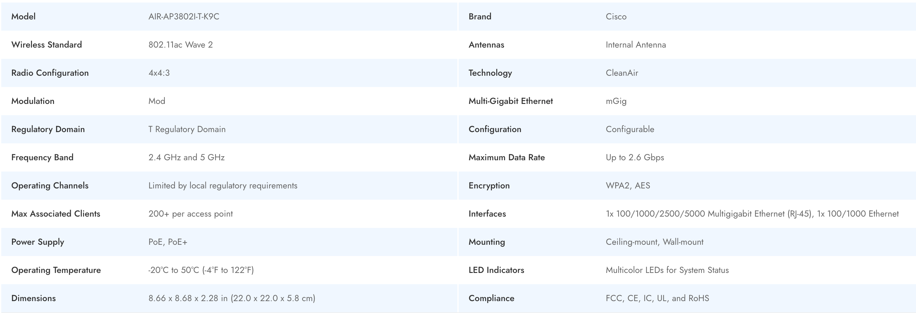 The Cisco AIR-AP3802I-T-K9C is an enterprise-class access point engineered for high-density, mission-critical environments. Featuring the latest 802.11ac Wave 2 standard, it delivers enhanced wireless speed, efficiency, and seamless connectivity across 2.4 GHz and 5 GHz bands. With built-in CleanAir technology, internal antennas, and robust security support including WPA2/AES, the AIR-AP3802I-T-K9C ensures interference-free, secure Wi-Fi experiences. Multi-Gigabit Ethernet and configurable mounting make it a versatile solution for demanding office, campus, or large venue wireless deployments.