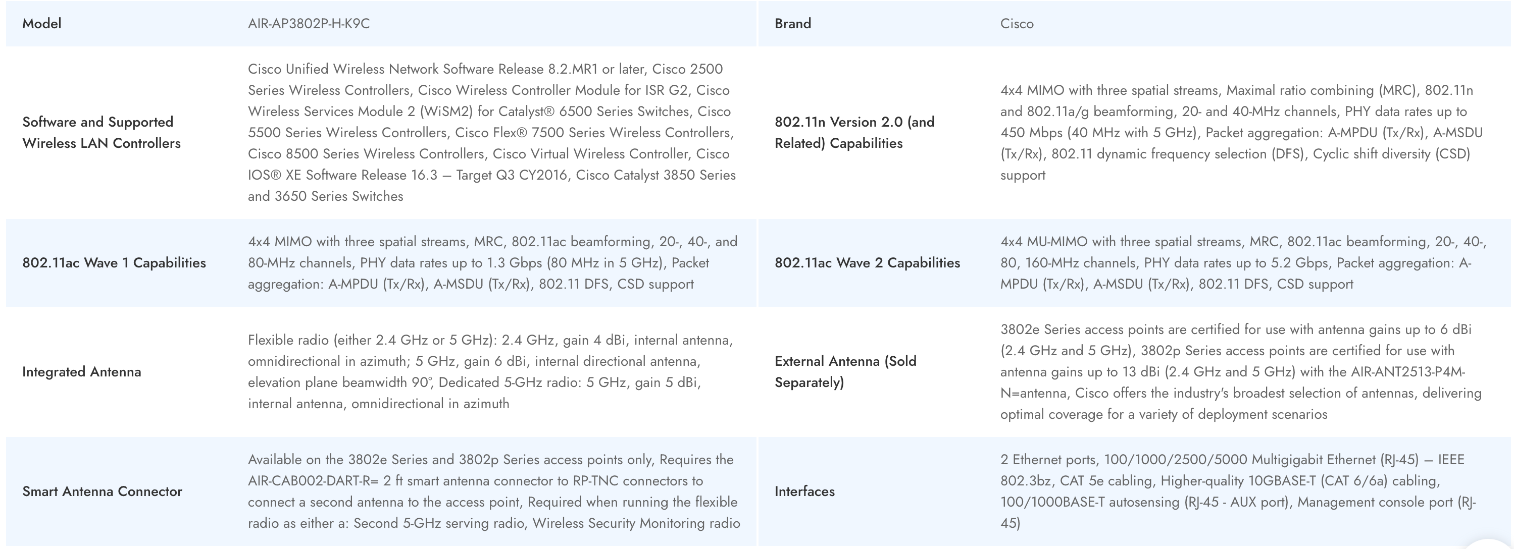 The Cisco AIR-AP3802P-H-K9C is an advanced business-class access point engineered to deliver high-density, high-capacity Wi-Fi for modern enterprise environments. Supporting 802.11ac Wave 2, it provides robust 4x4 MU-MIMO and multigigabit Ethernet connectivity. Its flexible dual-radio design boosts wireless throughput, while enhanced security and broad controller compatibility ensure seamless integration. With optimized performance for dynamic, device-heavy networks, the AIR-AP3802P-H-K9C is ideal for organizations that demand scalable, future-ready wireless infrastructure.