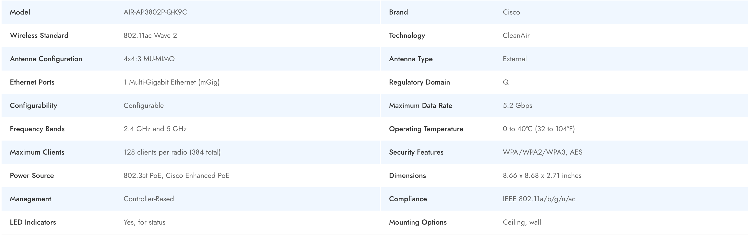 The Cisco AIR-AP3802P-Q-K9C is an advanced enterprise access point designed for scalable wireless deployments. Featuring the 802.11ac Wave 2 wireless standard and CleanAir technology, it delivers exceptional connectivity and security for demanding business networks. Its configurable 4x4:3 MU-MIMO antenna system and external antenna support make it ideal for dense environments requiring maximum throughput and flexible installation options. With robust security features and support for the latest WPA3 protocol, this Cisco access point ensures reliable coverage for up to 384 clients, making it an outstanding choice for modern organizations.