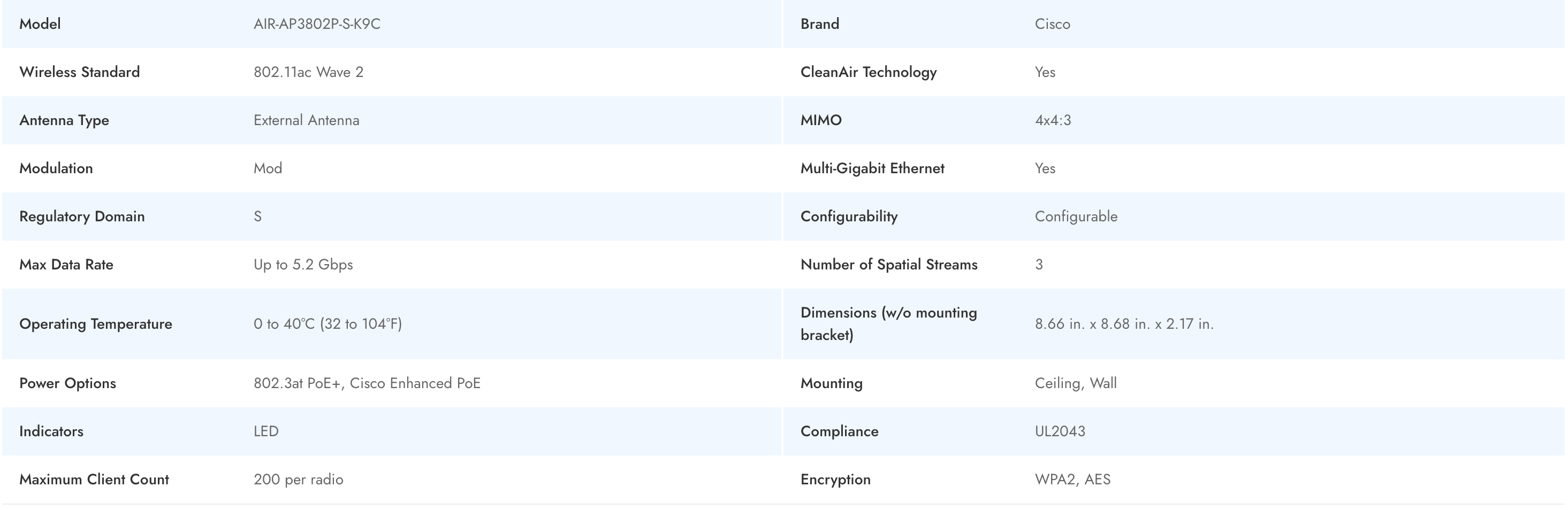 The Cisco AIR-AP3802P-S-K9C is an enterprise-grade access point engineered for high-performance wireless networking in business environments. Featuring external antennas and the advanced 802.11ac Wave 2 wireless standard, this access point delivers up to 5.2 Gbps for demanding connectivity. Enhanced with Cisco CleanAir technology, robust encryption, and multi-gigabit Ethernet support, it guarantees reliable, secure wireless coverage for diverse deployment scenarios such as offices, campuses, and vertical solutions. Its flexible mounting options and configurability help IT teams scale and manage secure wireless infrastructure with ease.