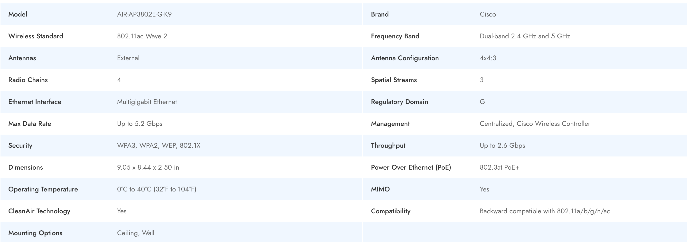 The Cisco AIR-AP3802E-G-K9 is an advanced 802.11ac Wave 2 wireless access point designed to deliver high-performance wireless networking with CleanAir technology. It features a 4x4:3 MIMO configuration, modular design, external antennas, and mGig support, making it ideal for high-density environments. The G Regulatory Domain ensures compliance with global wireless regulations.