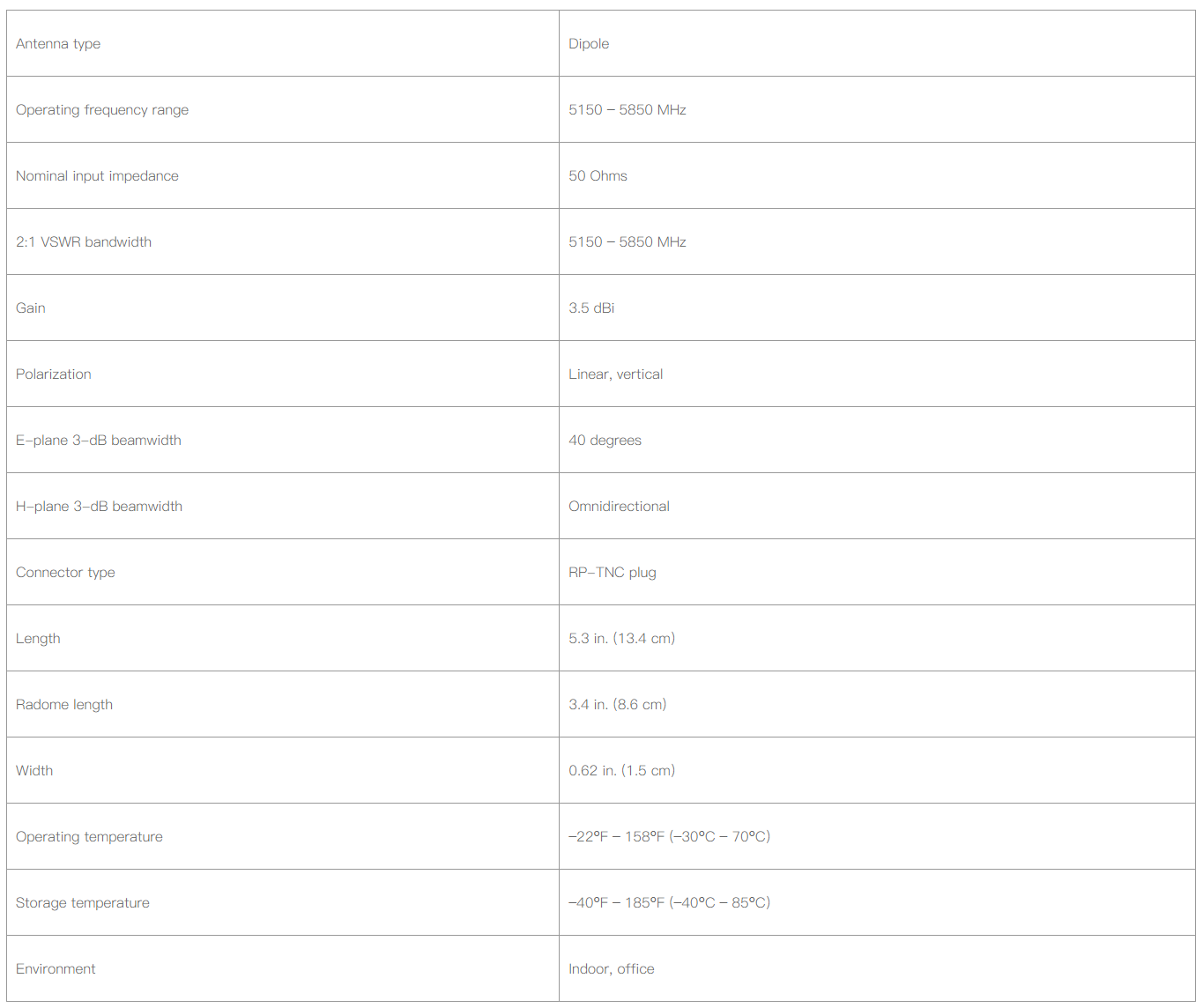 The Cisco Aironet 3.5-dBi Articulated Dipole Antenna operates in the 5-GHz frequency band and is designed for use with Cisco Aironet 5-GHz radio products using an RP-TNC connector.