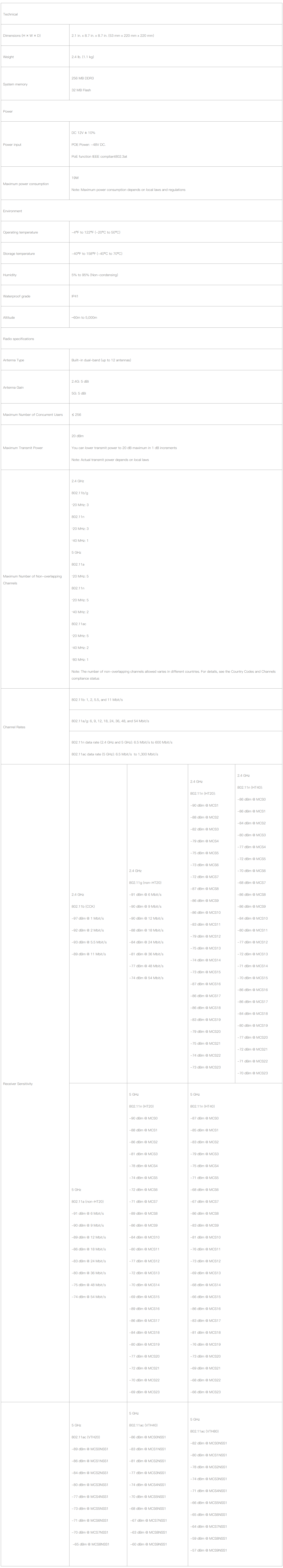 • 3 x 3 Multiple-Input Multiple-Output (MIMO), three spatial streams, 600 Mbit/s at 2.4 GHz radio, 1.3 Gbit/s at 5 GHz radio, and 1.9 Gbit/s system rate for the AP7030DE
