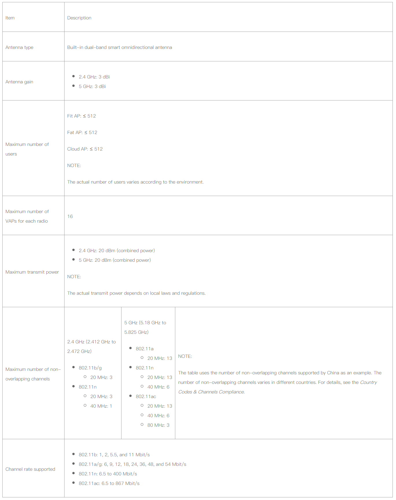 Huawei AP3050DE is a wireless access point (AP) in the business distribution market that supports 802.11ac Wave 2, 2 x 2 MIMO, and two spatial streams. It provides comprehensive service support capabilities and features high reliability, high security, simple network deployment, automatic AC discovery and configuration and real-time management and maintenance, which meets network deployment requirements. The AP has built-in smart antennas, complies with 802.11n and 802.11ac protocols, and can provide gigabit STA access, which greatly improves user experience on wireless networks and applies to small- and mediumsized enterprises, airports and stations, stadiums, cafes, and recreation centers.