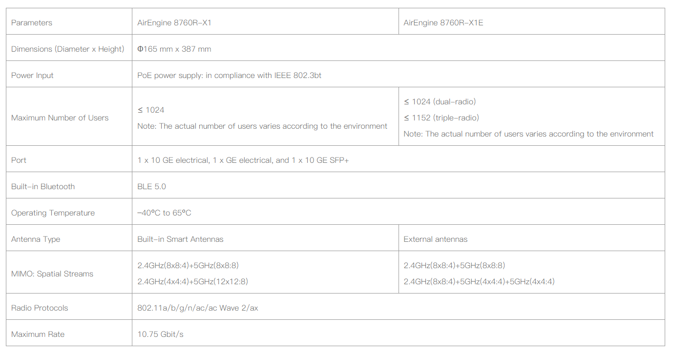 AirEngine 8760R-X1 is next generation, flagship, outdoor Access Points (APs) that fully comply with Wi-Fi 6 (802.11ax) standards. Available with either built-in (AirEngine 8760R-X1) or external (AirEngine 8760R-X1E) antennas, each offers 16 spatial streams, achieving a device rate of up to 10.75 Gbit/s, as well as supporting 8T8R on the 2.4 GHz frequency band.