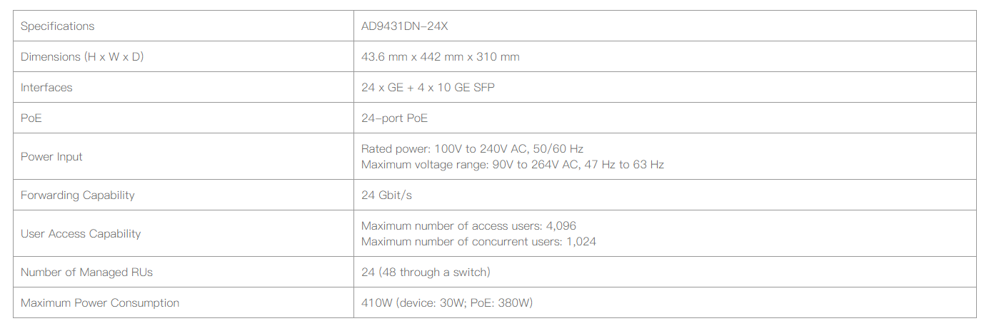 Huawei AD9431DN-24X central Access Point, with four 10GE uplink ports, up to 24 Remote Units (RUs), PoE