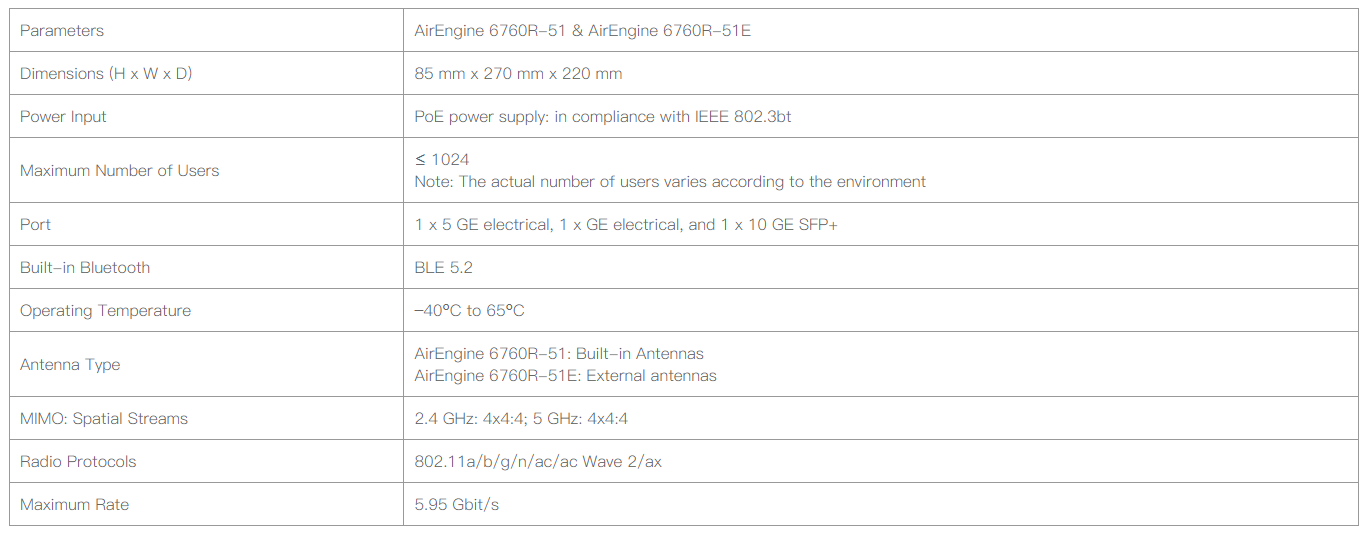 AirEngine 6760R-51 and AirEngine 6760R-51E are next generation, high-performance outdoor Access Points (APs) that fully comply with Wi-Fi 6 (802.11ax) standards. Available with either built-in (AirEngine 6760R-51) or external (AirEngine 6760R-51E) antennas, both support 8x8 MU-MIMO and are capable of achieving a device rate of up to 5.95 Gbit/s.