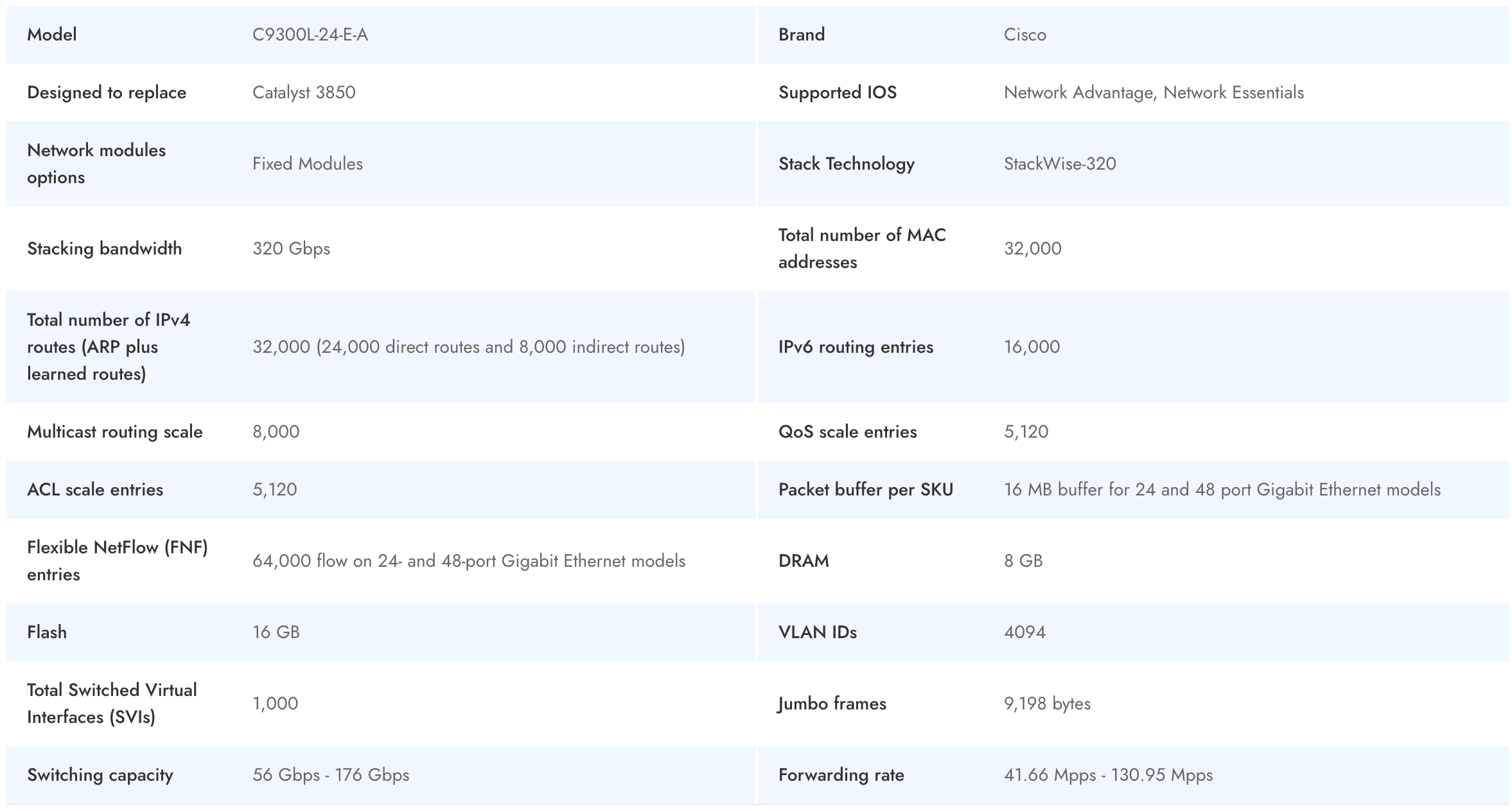 The Cisco C9300L-24-E-A is a high-performance enterprise-level switch designed to deliver robust, secure connectivity in modern business networks. As a leading Cisco Catalyst solution, it enables scalable campus environments with advanced enterprise architecture and seamless stackable switching. This switch supports demanding applications with a significant forwarding rate and high switching capacity, ensuring reliable data processing and traffic aggregation at the core and edge. Integrated PoE+ functionality provides dedicated power to connected devices, simplifying deployment for IP phones, wireless access points, and surveillance equipment. The C9300L-24-E-A is engineered for easy management and flexibility, featuring StackWise-320 for high-bandwidth stacking and fixed module options to maintain hardware efficiency. Network administrators benefit from comprehensive support for both IPv4 and IPv6, extensive VLAN capabilities, and advanced QoS for superior service quality. This model effectively replaces the legacy Catalyst 3850, expanding operational uptime and reducing costs through improved stacking, buffer management, and streamlined network operation. With its mix of innovative features and Cisco's reputation for secure, reliable hardware, the C9300L-24-E-A offers exceptional value for distributors, integrators, and end users seeking future-proof switching infrastructure. The result is optimized performance and security for evolving enterprise needs, regardless of deployment region or vertical.
