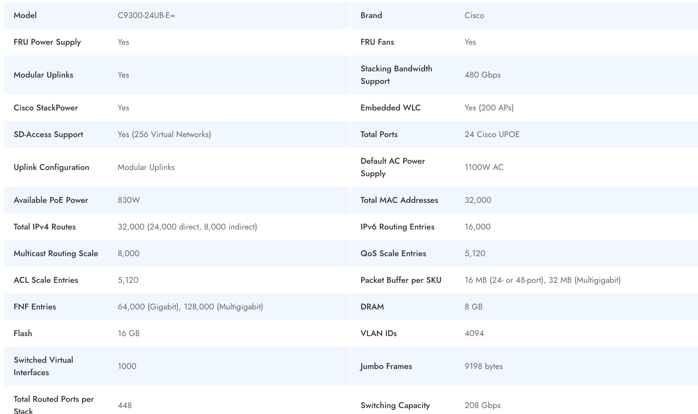 The Cisco C9300-24UB-E= is an enterprise-class network switch designed to deliver agility, security, and intelligent networking in complex enterprise environments. Positioned as a flagship model within the renowned Catalyst 9300 Series, this Cisco switch is engineered to meet the advanced connectivity needs of evolving corporate infrastructures. Fully enabled with comprehensive Network Essentials features, the device ensures seamless management, policy enforcement, and security across expansive networks. Integrated Ultra Power over Ethernet (UPOE) technology provides high-capacity power delivery and flexibility for a wide range of endpoint devices, optimizing performance for modern business applications. For system integrators and IT managers, the Catalyst 9300 platform balances superior throughput, advanced PoE support, and granular segmentation. The C9300-24UB-E= supports robust stacking bandwidth, empowering organizations to scale efficiently while simplifying maintenance. The inclusion of an embedded wireless controller brings unified access to up to 200 access points, further streamlining deployments. Designed for the global market, its extensive certifications and modular uplink options address data compliance and varied deployment scenarios, making it an optimal solution for dynamic, high-density enterprises across Asia, Europe, Africa, and North America. Whether you are an end-user demanding reliable daily connectivity, a distributor optimizing your offering, or an integrator building secure, scalable architectures, the Cisco Catalyst 9300-24UB-E= ensures that network infrastructure remains both future-ready and operationally efficient.