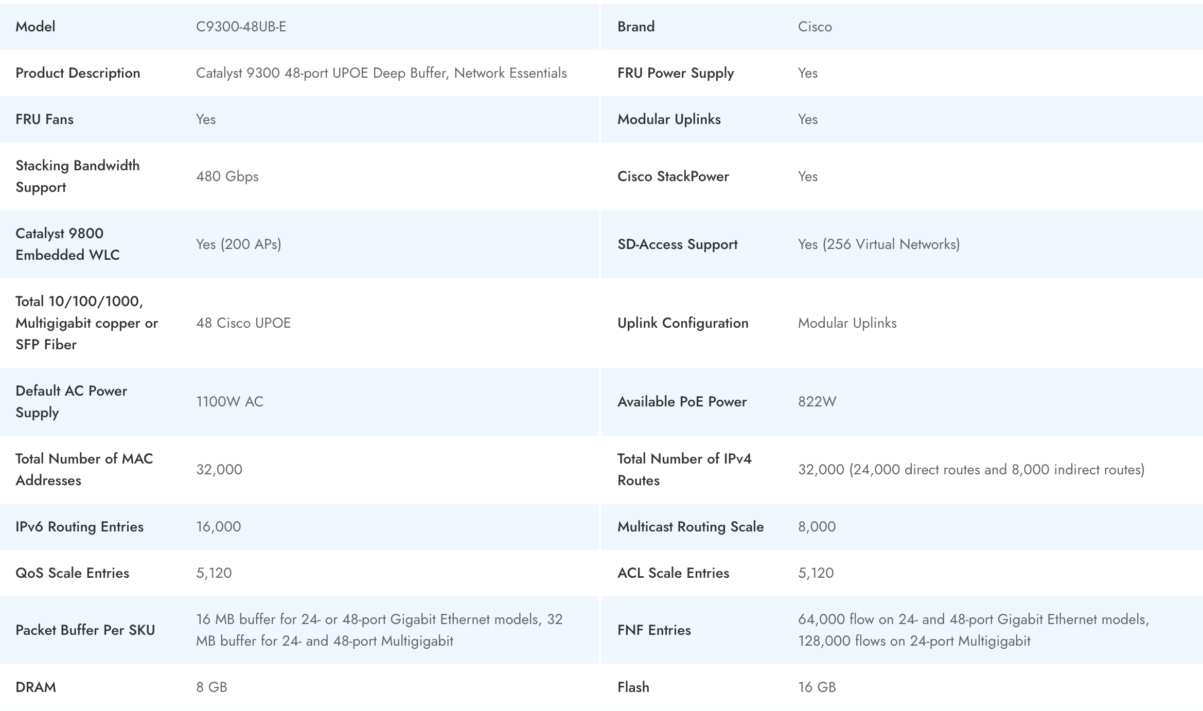The Cisco C9300-48UB-E is an enterprise-class switch designed to empower digital transformation and optimized for secure, high-performance enterprise switching environments. As a part of the Cisco Catalyst family, the C9300-48UB-E offers Ethernet switches with advanced UPOE capabilities to power a variety of devices, making it ideal for diverse deployment needs in modern organizations. It stands out with robust 48-port UPOE support, offering deep packet buffers and state-of-the-art traffic management, ensuring seamless network access and resilient connectivity for all users. With StackPower for resilient power sharing, advanced SD-Access functionality, and deep feature integration for virtual networks and wireless, this switch is purpose-built for high-density, secure, and flexible enterprise networks. The C9300-48UB-E is the proven choice for large campuses and organizations where scalable Ethernet switches and advanced enterprise switching are core requirements for digital workplace outcomes. Its robust security, Cisco Catalyst platform reliability, and flexible UPOE power delivery make it a trusted component of any critical infrastructure, while comprehensive management and automation streamline operational efficiency. Delivering next-generation performance for unified wired and wireless solutions, the C9300-48UB-E switch is ideal for environments demanding rapid expansion and ultimate reliability, supporting the business’s growing needs thanks to intuitive interface, rich Cisco Catalyst feature sets, and scalable enterprise switching architectures.
