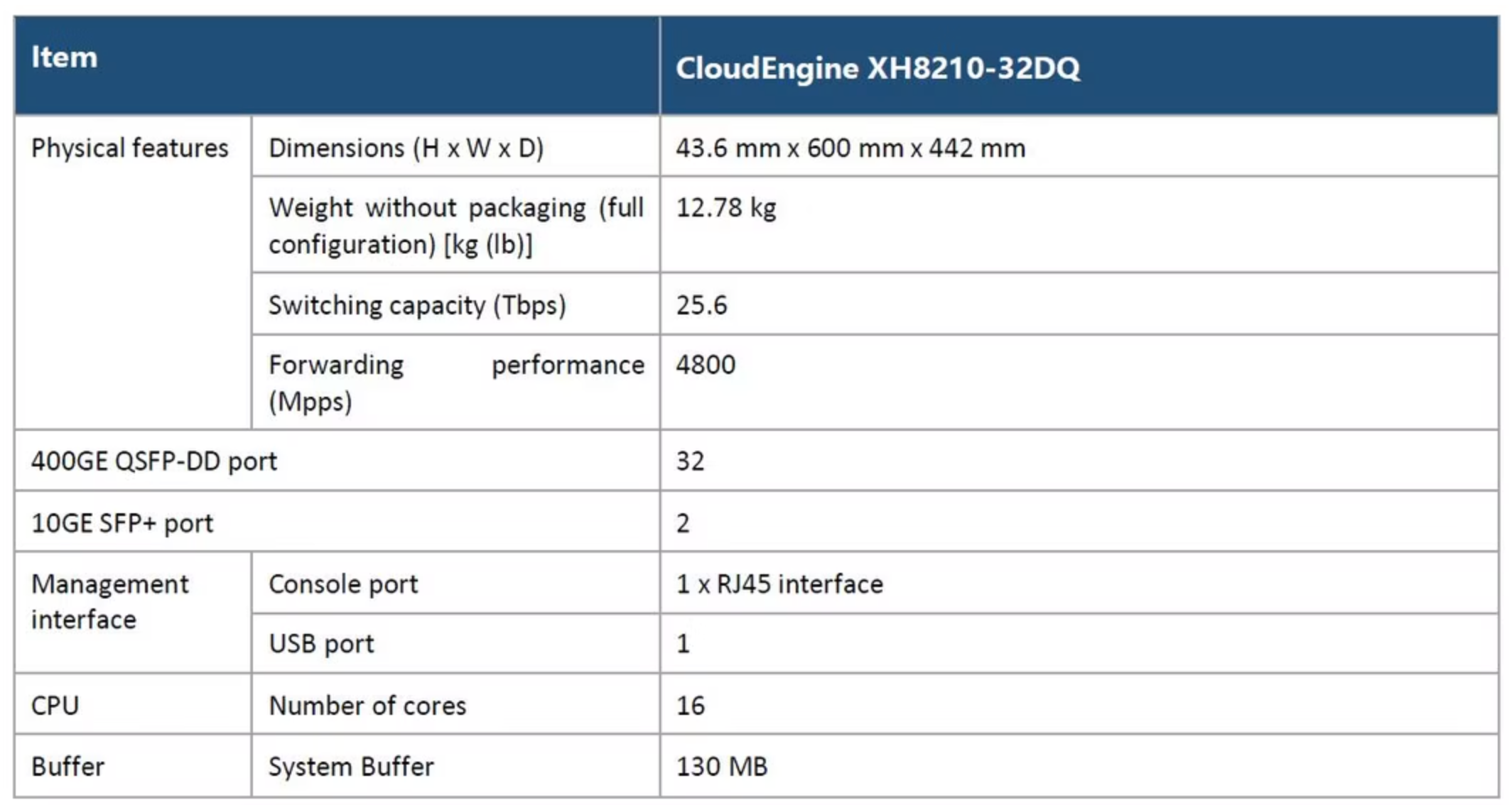 Huawei CloudEngine XH8210 series switches are next-generation high-performance and high-density 400GE access switches designed for DC scenarios. They have an advanced hardware architecture, offer high-density 400GE access ports, support 400GE uplink ports, and deliver a wide range of DC service features. CloudEngine XH8210 series switches can work with CloudEngine 16800/16800-X series DC core switches to build an elastic, virtualized, high-quality, and fully-connected 40GE/100GE/200GE DC network (DCN), meeting network requirements of DCs in the cloud era. CloudEngine XH8210 series switches provide high-density 400GE access to help enterprises and carriers build DCNs in the cloud computing era. They can also be used as core or aggregation devices of campus networks.