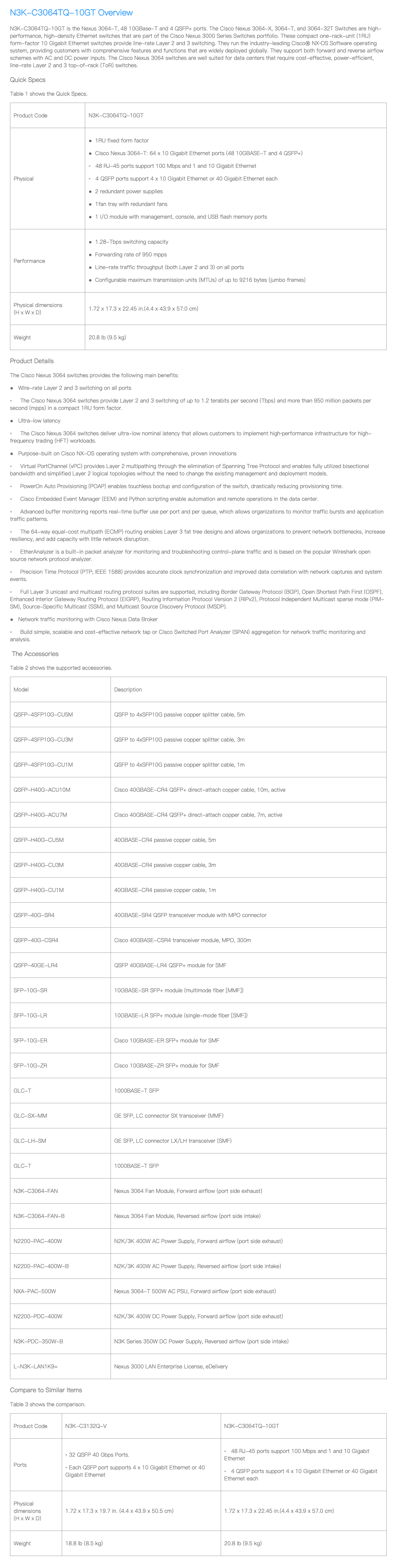 Cisco N3K-C3064TQ-10GT Nexus 3000 Series switch Nexus3064-T, 48 10GBase-T and 4 QSFP+ ports