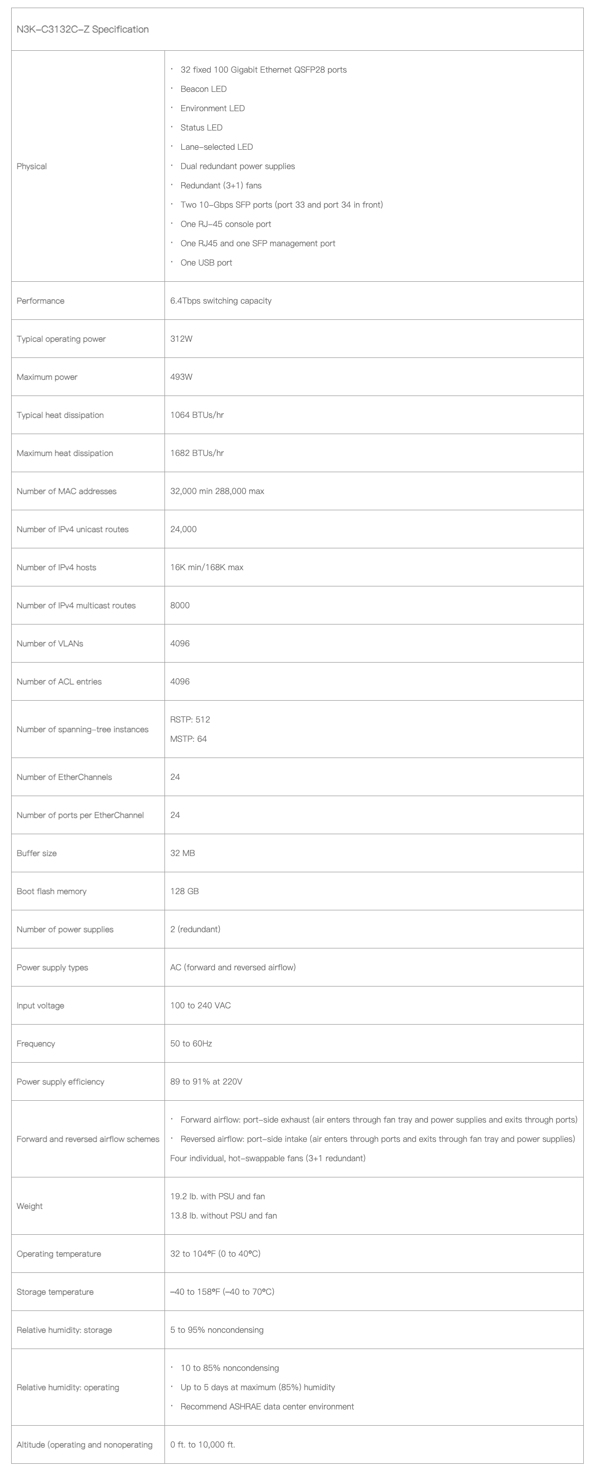 The Cisco Nexus 3000 Series Switches are a comprehensive portfolio of 1, 10, 40, and 100 Gigabit Ethernet switches built from a Switch-on-a-Chip (SoC) architecture. Introduced in April 2011, this series of switches provides line-rate Layer 2 and 3 performance and is suitable for Top-of-the-Rack (ToR) architecture.The Cisco Nexus 3132C-Z is the 32-port 100-Gbps programmable architecture switch, enabled with major data center features designed for software-defined data centers. This 1-Rack-Unit (1RU) model offers wire-rate Layer 2 and 3 switching.The Cisco Nexus 3132C-Z (Figure 1) is a Quad Small Form-Factor Pluggable (QSFP) switch with 32 QSFP28 ports. Each QSFP28 port can operate at 10, 25, 40, 50, and 100 Gbps, up to a maximum of 128 x 25-Gbps ports.It is a member of the Cisco Nexus 3100 platform and runs the industry-leading Cisco®NX-OS Software operating system, providing customers with comprehensive features and functions that are widely deployed. The Cisco Nexus 3132C-Z supports both forward and reverse (port-side exhaust and port-side intake) airflow schemes with AC and DC power inputs.