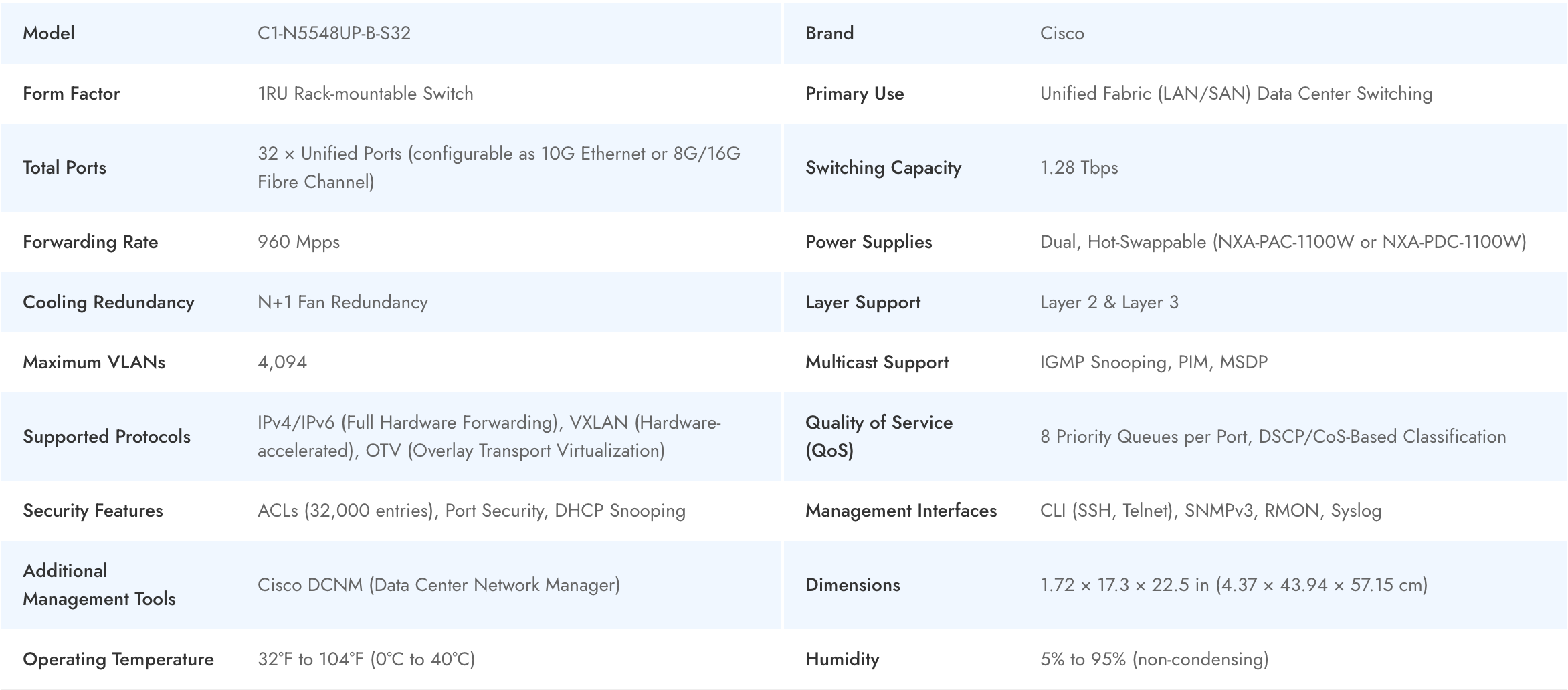The Cisco C1-N5548UP-B-S32 is a high-end enterprise LAN switch built to meet the demands of modern data center and hybrid network environments, making it an ideal choice for organizations in Asia, Europe, Africa, and North America. This 32 port switch leverages Cisco ONE architecture to deliver a unified approach to both LAN and SAN switching, offering flexible deployment for distributed enterprises, small and medium integrators, and end-users aiming for seamless connectivity and scalability. Each unified port can be configured for 10G Ethernet or Fibre Channel, ensuring versatile connectivity options for various topologies. Designed as a next-generation LAN switch, it features 1.28 Tbps switching capacity and up to 960 Mpps forwarding rate, delivering true wire-speed performance for virtualization, cloud, and big data workloads. With advanced features like Layer 2 & 3 support, integrated security with extensive ACLs, robust quality of service, and support for Cisco ONE network services, this 32 port switch is engineered to simplify management, enhance agility, and offer investment protection to distribution partners and end-users. Comprehensive support for Cisco Data Center Network Manager and open management standards ensures future-proof operations for any enterprise. As part of Cisco's unified fabric approach, this switch is the keystone solution for next-generation hybrid networks, offering agility, reliability, and performance in every deployment scenario.