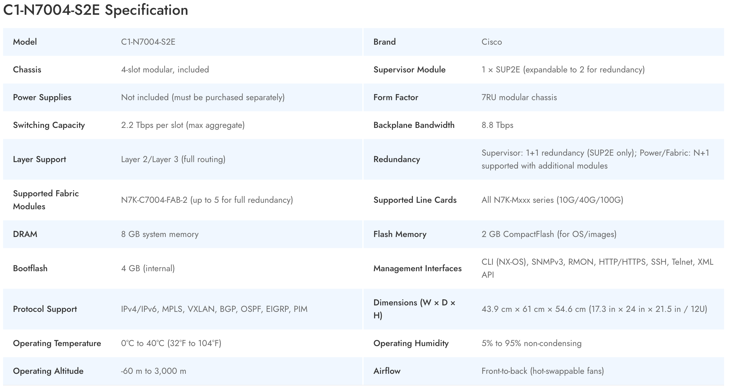 The Cisco C1-N7004-S2E is an enterprise-class, modular switch designed for core data center deployments, offering a balance of high-density scalability and reliable network backbone. As part of the renowned Cisco Nexus family, it features a 4-slot modular chassis, ensuring seamless upgrades and flexibility. This switch delivers cisco nexus switches-level performance, equipped with a robust supervisor engine for enhanced reliability and NEBS (Network Equipment Building System) compliance, making it ideal for critical infrastructure builds. With comprehensive Layer 2 and Layer 3 capabilities, the C1-N7004-S2E empowers IT leaders with advanced protocol support such as BGP, OSPF, and VXLAN. Remote administration is simplified through multiple management options, including CLI (NX-OS), SNMPv3, and web-based tools, ensuring efficient operation from any location. The C1-N7004-S2E also incorporates hot-swappable components and sophisticated redundancy options such as 1+1 supervisor and N+1 power/fabric support, which are vital for minimizing downtime in demanding business environments. For organizations seeking ultra-fast data throughput, this switch achieves up to 2.2 Tbps per slot and 8.8 Tbps backplane bandwidth, supporting a future-proof network core. In summary, the Cisco C1-N7004-S2E stands out as a high-capacity, NEBS-compliant modular switch that brings the performance, reliability, and remote administration needed to support mission-critical business applications across diverse market regions.