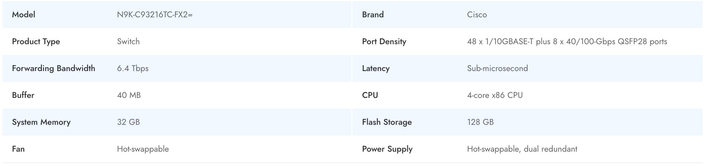 The Cisco N9K-C93216TC-FX2 is a high-performance enterprise-grade switch designed to meet the complex demands of modern networking environments. This Cisco Nexus 9300 series switch offers robust features and exceptional scalability, making it an ideal choice for large-scale data centers and enterprise networks. With its advanced networking capabilities, the N9K-C93216TC-FX2 ensures reliable and efficient connectivity for critical business applications. Its integration of cutting-edge technologies enhances network performance and provides seamless connectivity, thus optimizing overall operational efficiency. This switch is engineered to deliver high throughput, low latency, and enhanced security, ensuring it meets the stringent requirements of contemporary IT infrastructures.