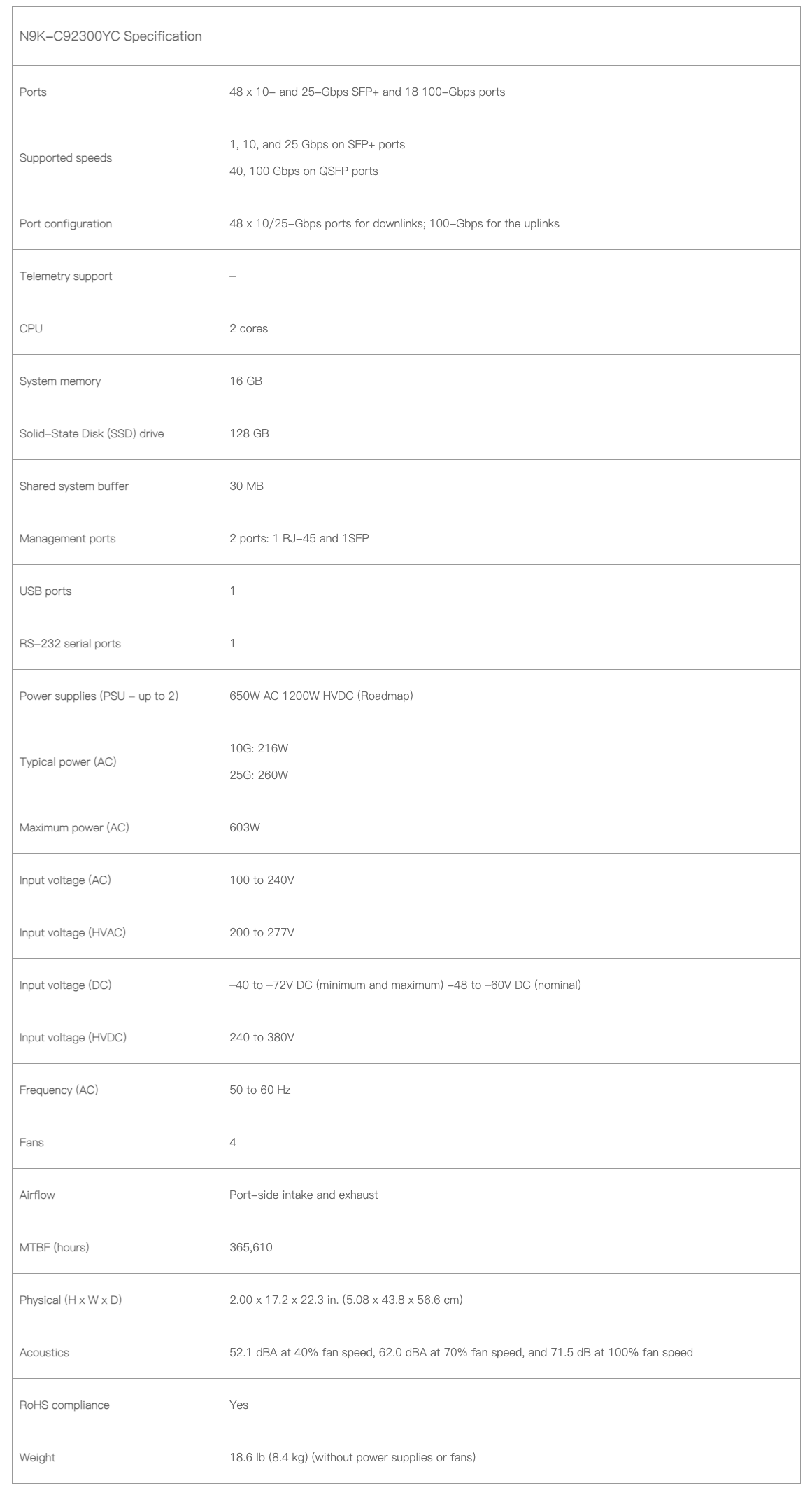 The Cisco N9K-C92300YC switch provides a switching capacity of 6.0 Tbps and forwards data at rates reaching up to 4.75 Bpps, making it suited for high-throughput scenarios.It features 48 ports supporting up to 25GB SFP+ connectivity and 18 QSFP28 interfaces delivering speeds as fast as 100GB per port. The device is designed to handle dynamic traffic loads and supports a MAC address table size accommodating up to approximately 92,000 entries.Its front-to-back airflow design is tailored for datacenter cooling needs while maintaining energy efficiency standards in its category.