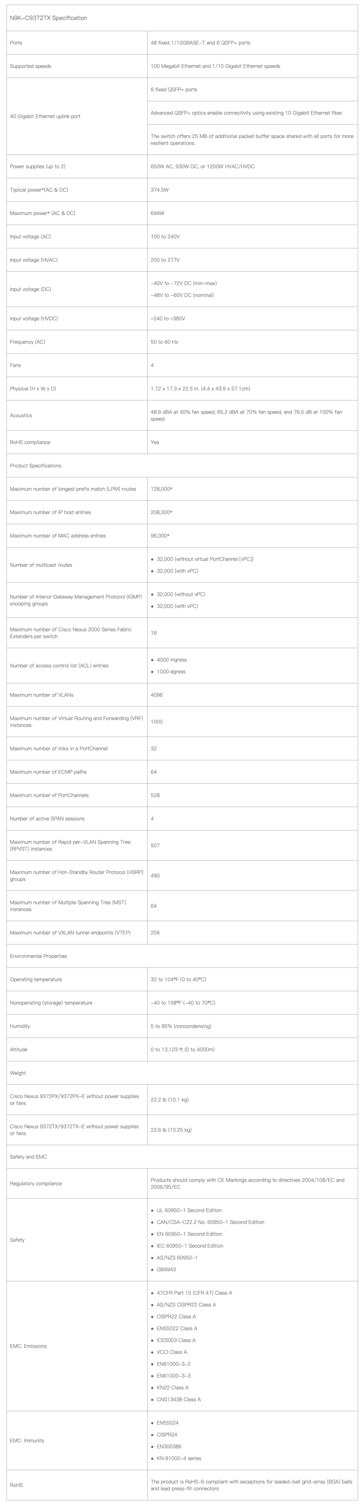 The Cisco N9K-C9372TX is a high-performance switch for data centers and enterprise networks. With 48x 10GB copper ports and 6x 40GB QSFP+ ports, this switch offers fast connectivity options to meet the demands of modern network infrastructures.With a switching capacity of up to 1.44 Tbps and a forwarding rate of up to 1150 mpps, the switch ensures smooth data transmission even in high-traffic environments. Its MAC address table size can accommodate 96,000 entries, providing efficient routing capabilities.This switch also features a back-to-front airflow design, which helps with cooling while maintaining optimal performance. It supports various advanced networking technologies such as Virtual Extensible LAN (VXLAN) for greater flexibility in virtualized environments.Cisco Nexus N9K-C9372TX: The Cisco Nexus 9372TX switch is a 1RU switch that supports 1.44 Tbps of bandwidth and over 1150 mpps across 48 fixed 10-Gbps BASE-T ports and 6x fixed 40-Gbps QSFP+ ports ). Nexus 9300 with 48p 1/10G-T and 6p 40G QSFP+. Front-to-Back Airflow (Forward Airflow / Port Side Exhaust).