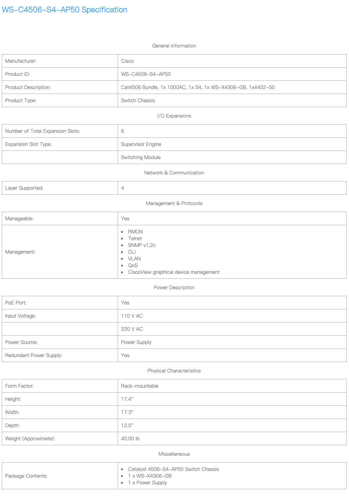The Catalyst 4506-S4-AP50 switch is a six-slot switch designed for high-performance, high-density wiring closet applications. The Catalyst 4506 switch supports the Supervisor Engine II, II+, II+10GE, III, IV, V, and V-10GE. The supervisor engine has a nonblocking, full-duplex, switching fabric that provides connections between the supervisor engine and the switching modules. The Gigabit Ethernet ports can be configured with any combination of copper 1000BASE-T, shortwave SX, LX/LH, and ZX interfaces, or CWDM and DWDM GBICs.