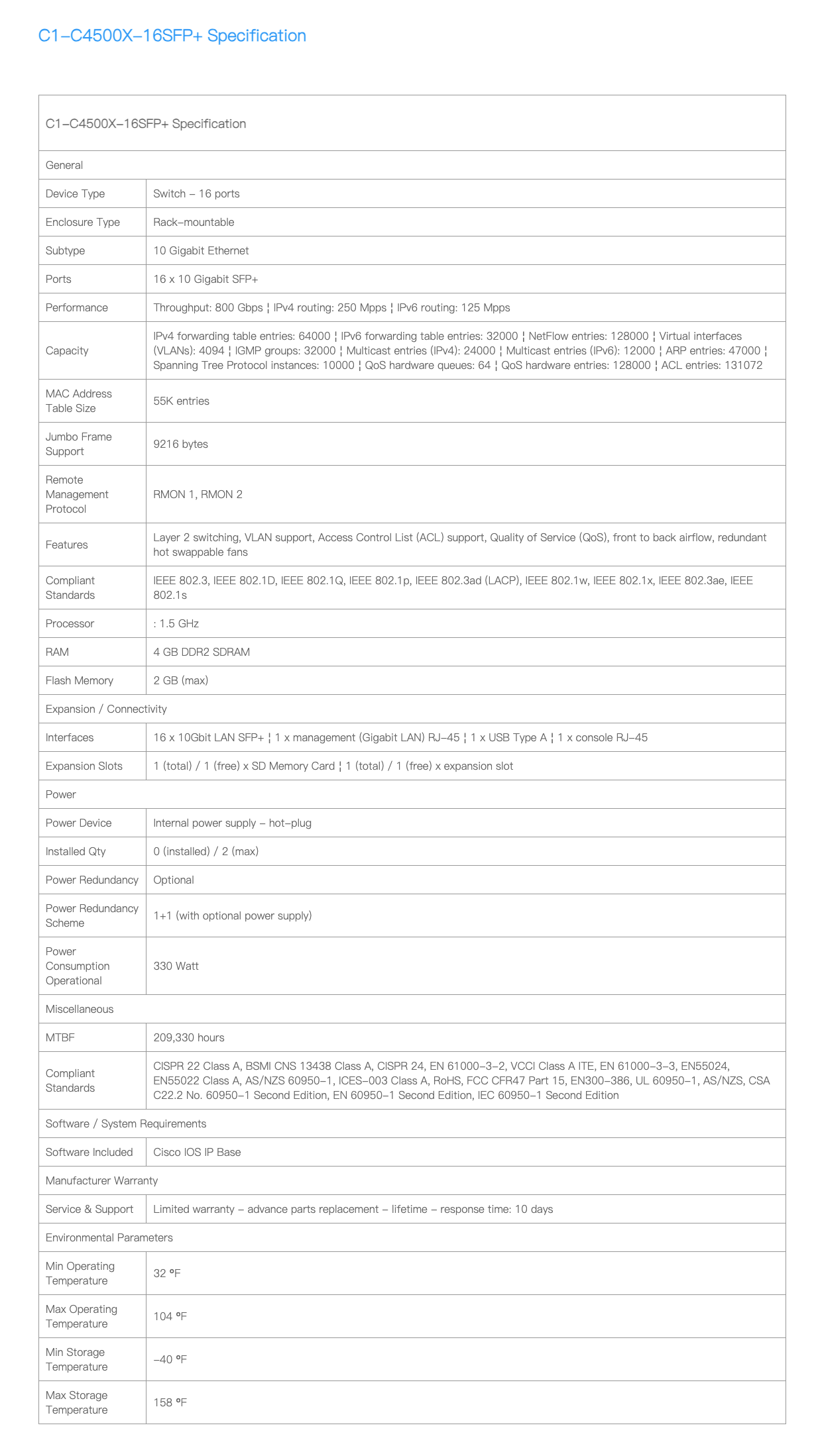 Cisco ONE Catalyst 4500-X 16 Port 10G IP Base, Front-to-Back, No P/S