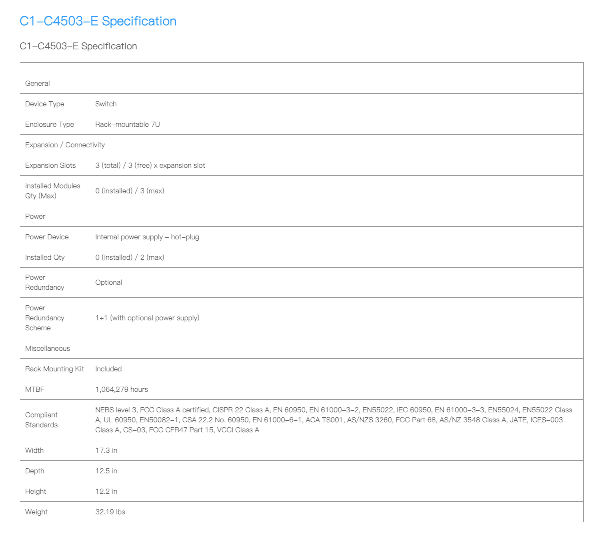The Cisco C1-C4503-E is an enterprise-grade modular switch built to deliver high availability, robust data power, and industry-proven design for deployments that demand reliability and scalability. As part of the Catalyst 4500-E series, this 3-slot chassis ensures the performance and flexibility required for distributed enterprise networks. The fixed configuration switch architecture makes it especially suitable for diverse organizational requirements, and its substantial switching capacity of up to 96 Gbps is ready to support both present-day and future network traffic. With advanced data power management, it offers support for multiple power supply options including PoE+ (Power over Ethernet Plus), efficiently delivering power and data to connected devices to reduce cable clutter and minimize deployment complexity. For mission-critical applications, NEBS Level 3 compliance ensures resilient operation in environments with stringent regulatory demands, while N+1 fan redundancy and hot-swappable power modules mean maintenance won't disrupt business continuity. Simplified licensing via Cisco ONE software not only streamlines feature upgrades and license portability but also offers regular SWSS updates, allowing investment protection as your network evolves. With operational temperature and humidity tolerance designed for global deployments across Asia, Europe, Africa, and North America, the C1-C4503-E meets the challenge of diverse installation sites. In essence, whether you're a distributor deploying for multiple enterprises, a system integrator designing for flexible expansion, or an end user requiring reliable NEBS-compliant switching, the Cisco C1-C4503-E is engineered to empower modern digital businesses with consistent performance and secure, scalable, and efficient network infrastructure.