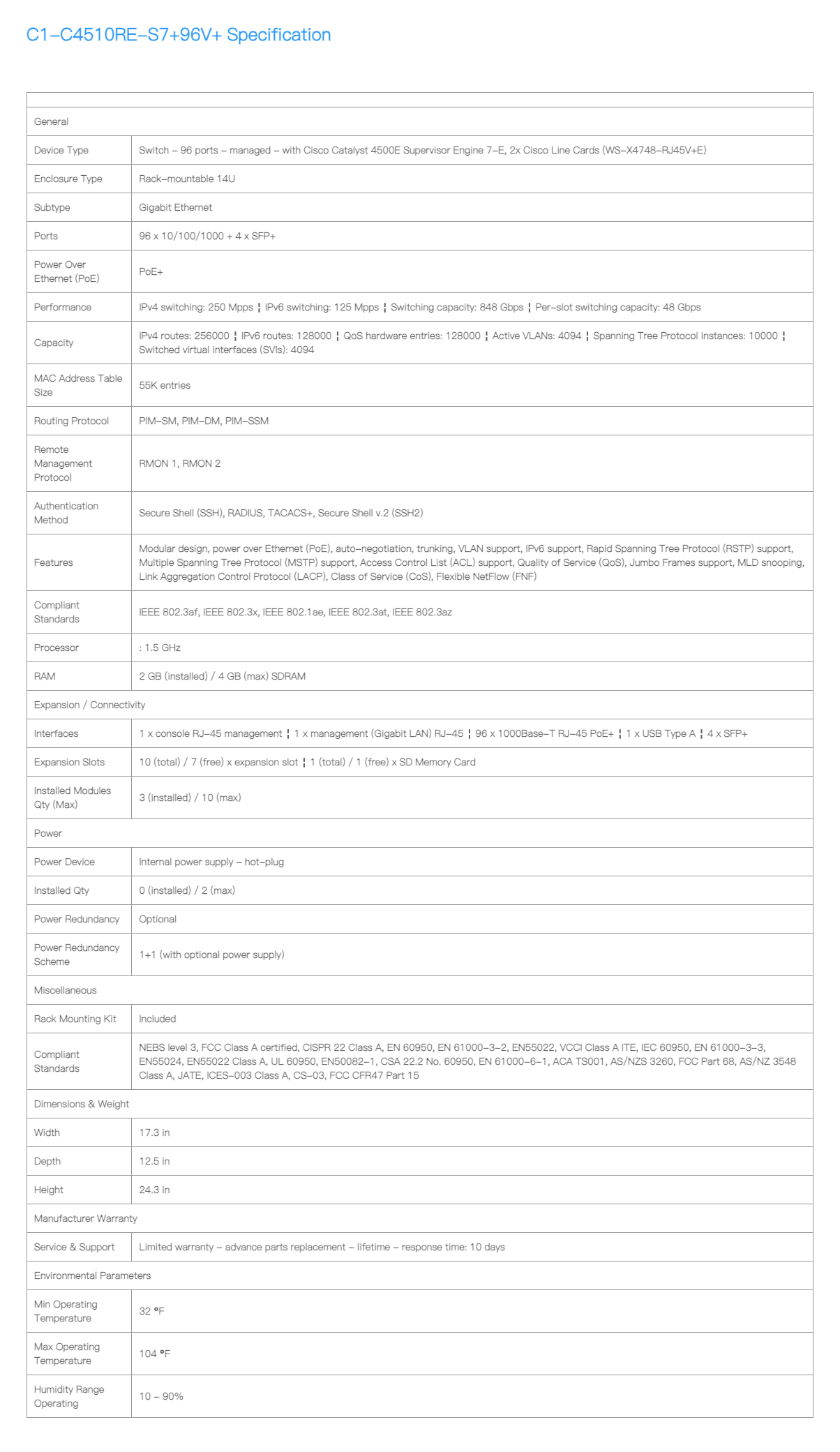 Cisco ONE 4510R+E Chassis, Two WS-X4748-RJ45V+E, Sup7-E