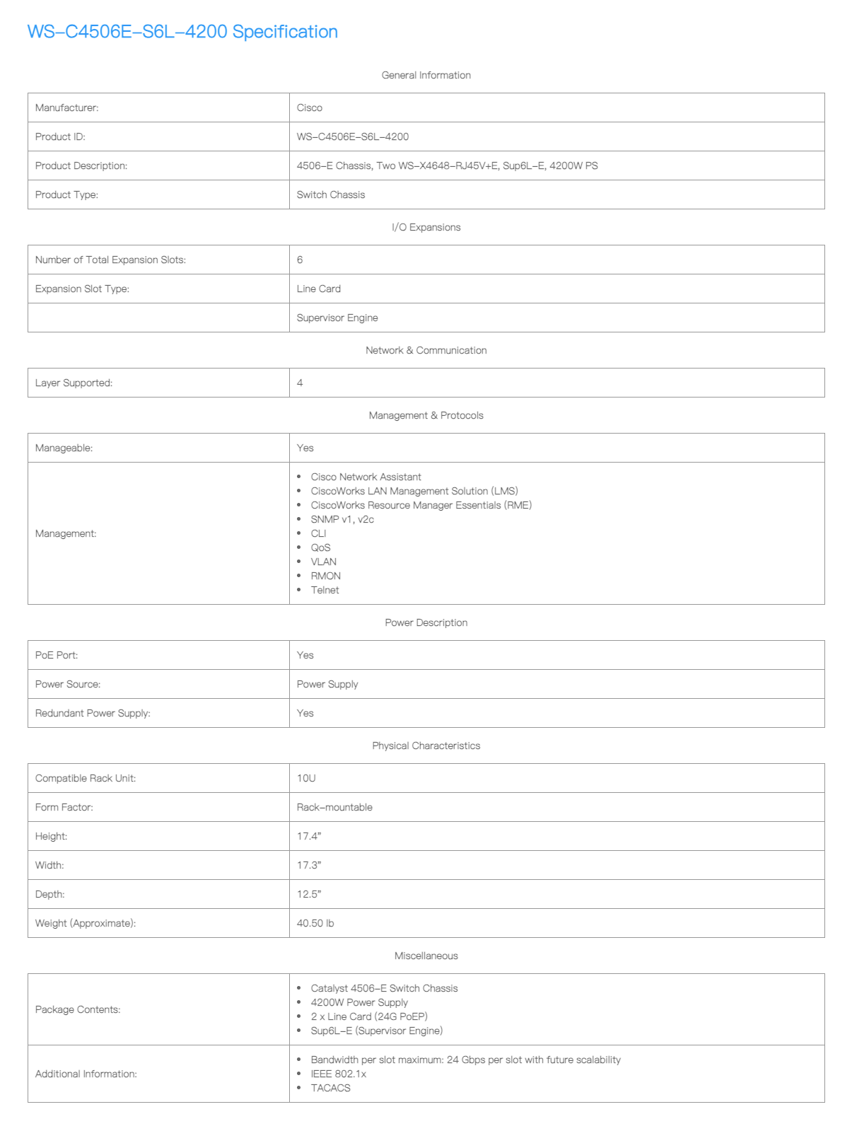 WS-C4506E-S6L-4200 Specification