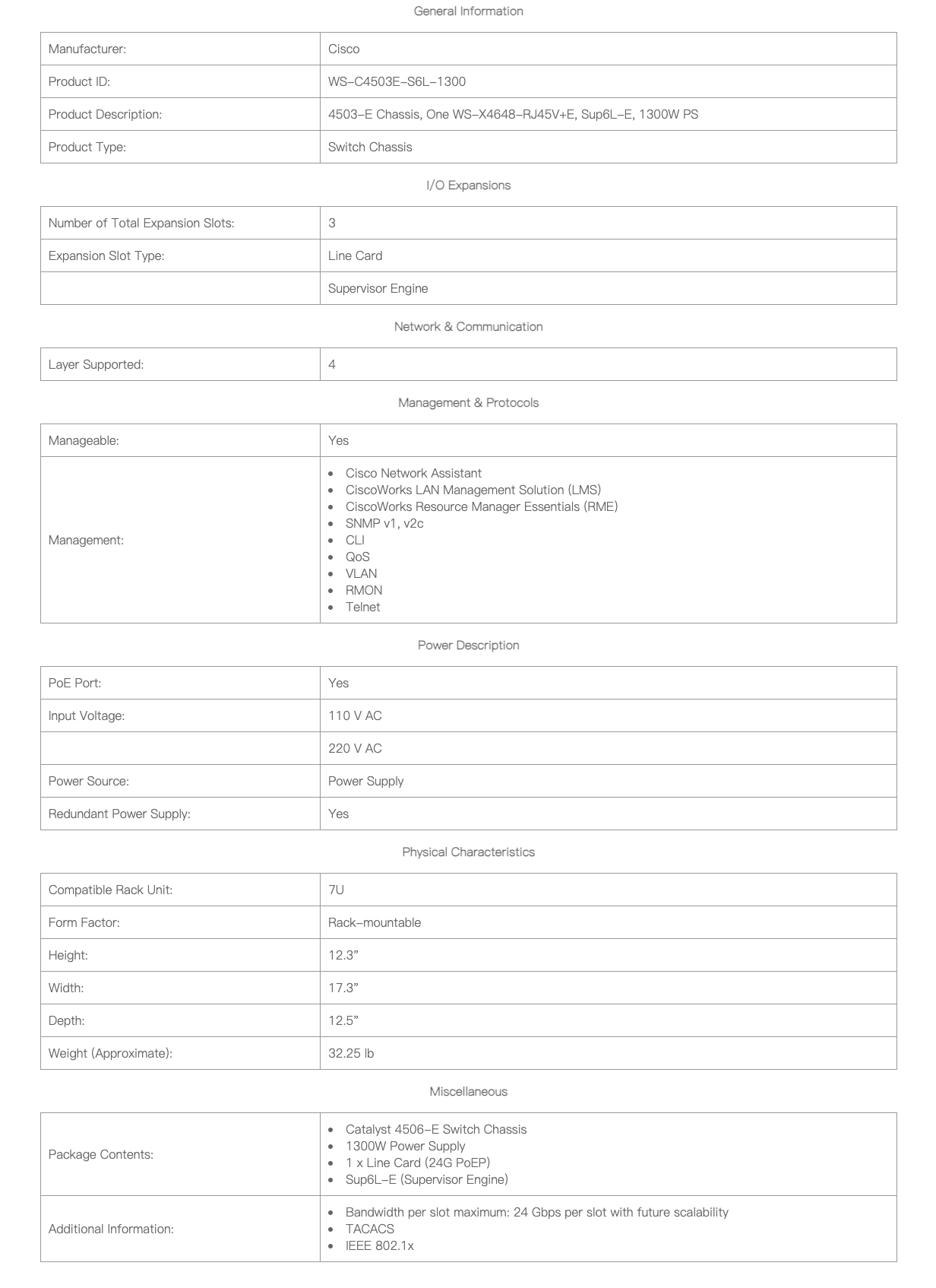 Catalyst 4503-E Switch Chassis has a centralized forwarding architecture that enables collaboration, virtualization and operational manageability through simplified operations. With forward and backward compatibility spanning multiple generations, the new Catalyst 4503-E Switch Chassis provides exceptional investment protection and deployment flexibility to meet the evolving needs of organizations of all sizes. Catalyst 4503-E Switch Chassis platform has 10G uplinks and PoEP support as standard enabling the customers to future proof their network.