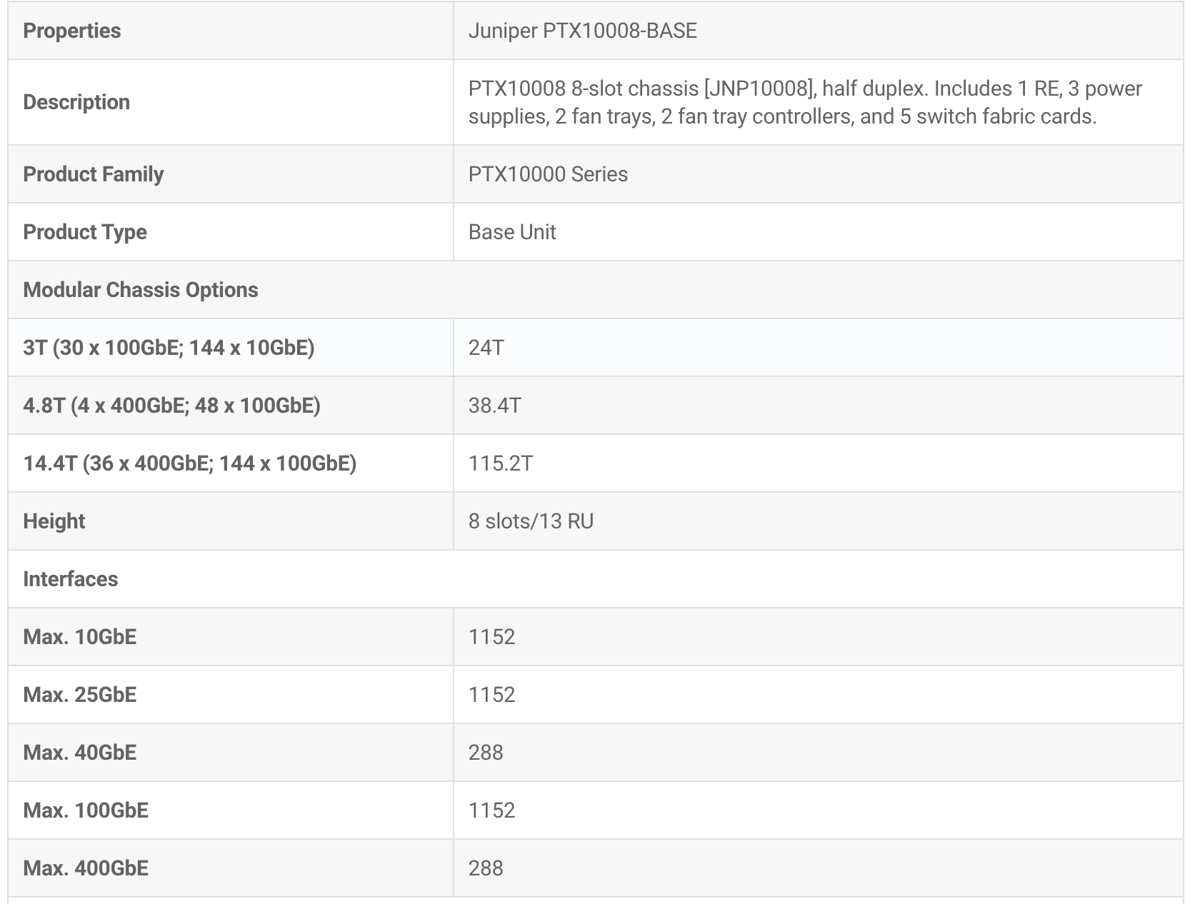The Juniper Networks PTX10008 Packet Transport Router enables cloud and data center operators to smoothly transition from 10-Gigabit and 40-Gigabit Ethernet networks to 100-Gigabit and 400-Gigabit Ethernet high-performance networks. This flexible, 13 rack unit (13-U) modular chassis has eight line card slots that can support a maximum of 288 400-Gigabit Ethernet ports that can also be configured as 576 200-Gigabit Ethernet ports, 1152 100-Gigabit Ethernet ports, 288 50-Gigabit Ethernet ports, 288 40-Gigabit Ethernet ports, 288 25-Gigabit Ethernet ports, or 1152 10-Gigabit Ethernet ports.