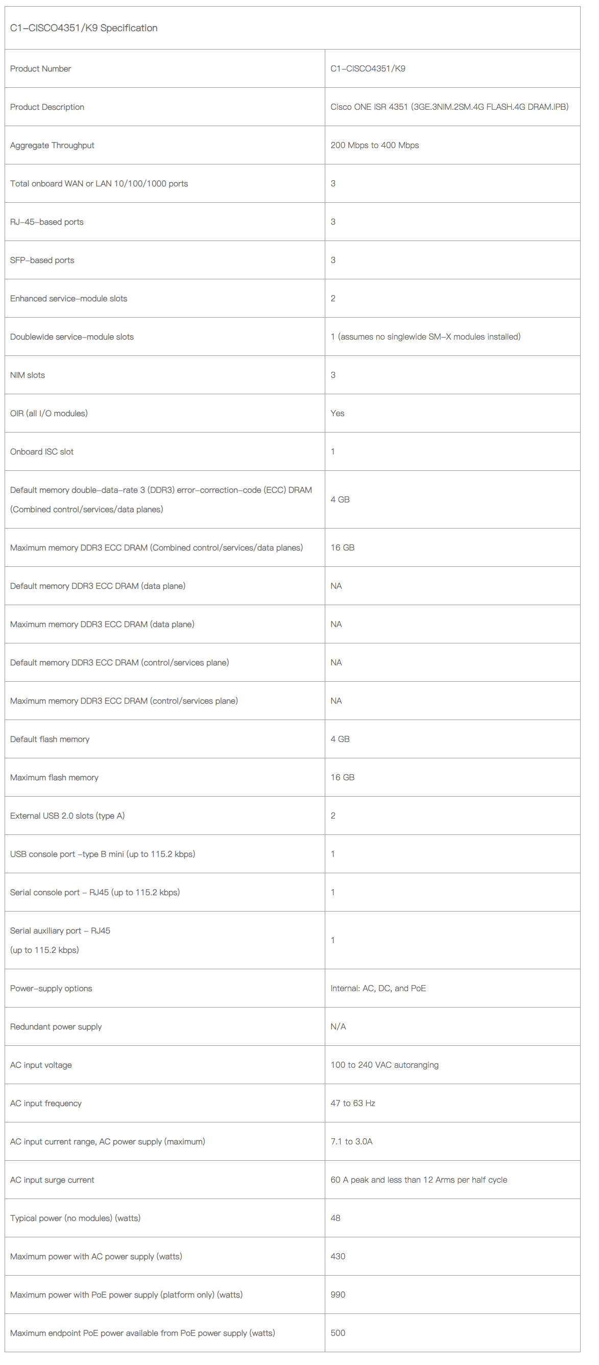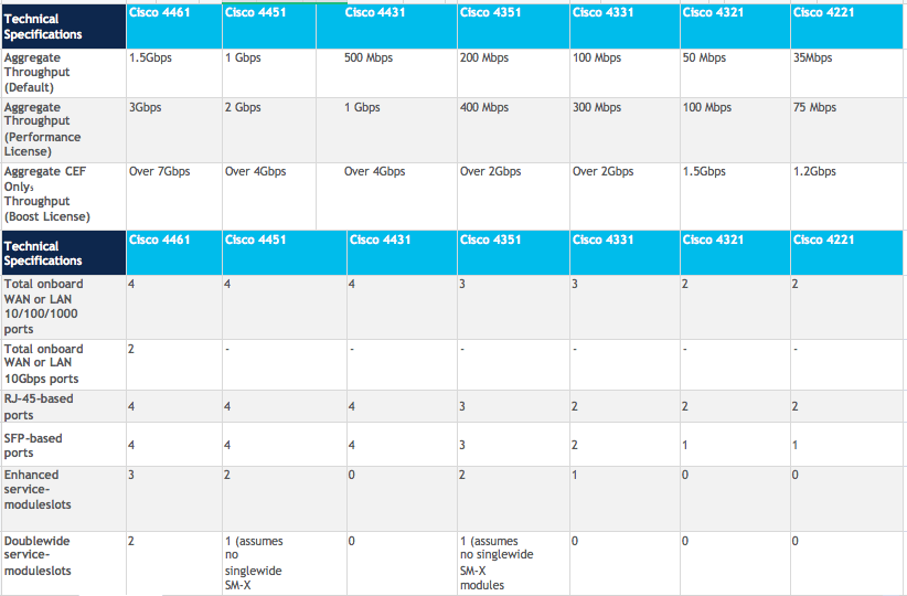Cisco 4351 Integrated Services Router, which supports 3 Network Interface Modules (NIM) slots, delivers 200 Mbps to 400 Mbps aggregate throughput. The Cisco C1-CISCO4351/K9 is the 4351 Cisco ONE Software Bundle.